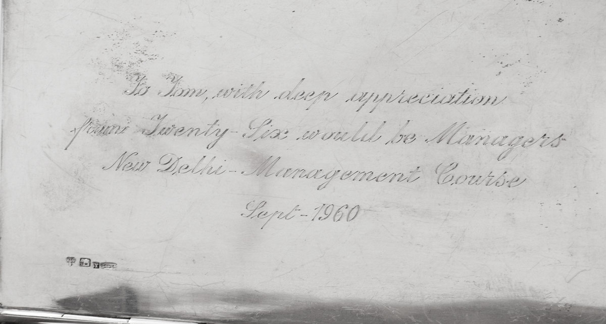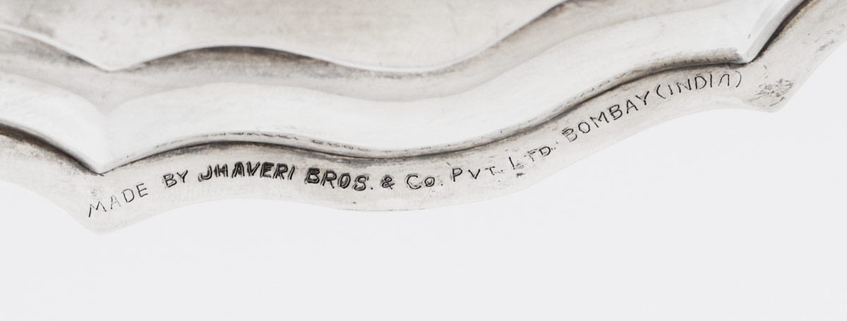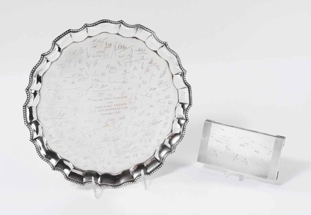 INDIAN SILVER PRESENTATION TRAY AND BOX: 2 pieces to include 1) Unique silver tray by Jhaveri Brothers & Co., presented to Tom And Ruby Caulkins, 1962 with impressions of signatures. 12 3/8'' dia. 2) Hamilton & Co. hinged lid box with engraved ducks in flight on top, foliate motif sides, on 4 feet. Presented inscription inside lid dated 1960. 3/4'' h. x 6'' x 3 3/8''. Approx. 30.8 troy oz., silver content unknown.