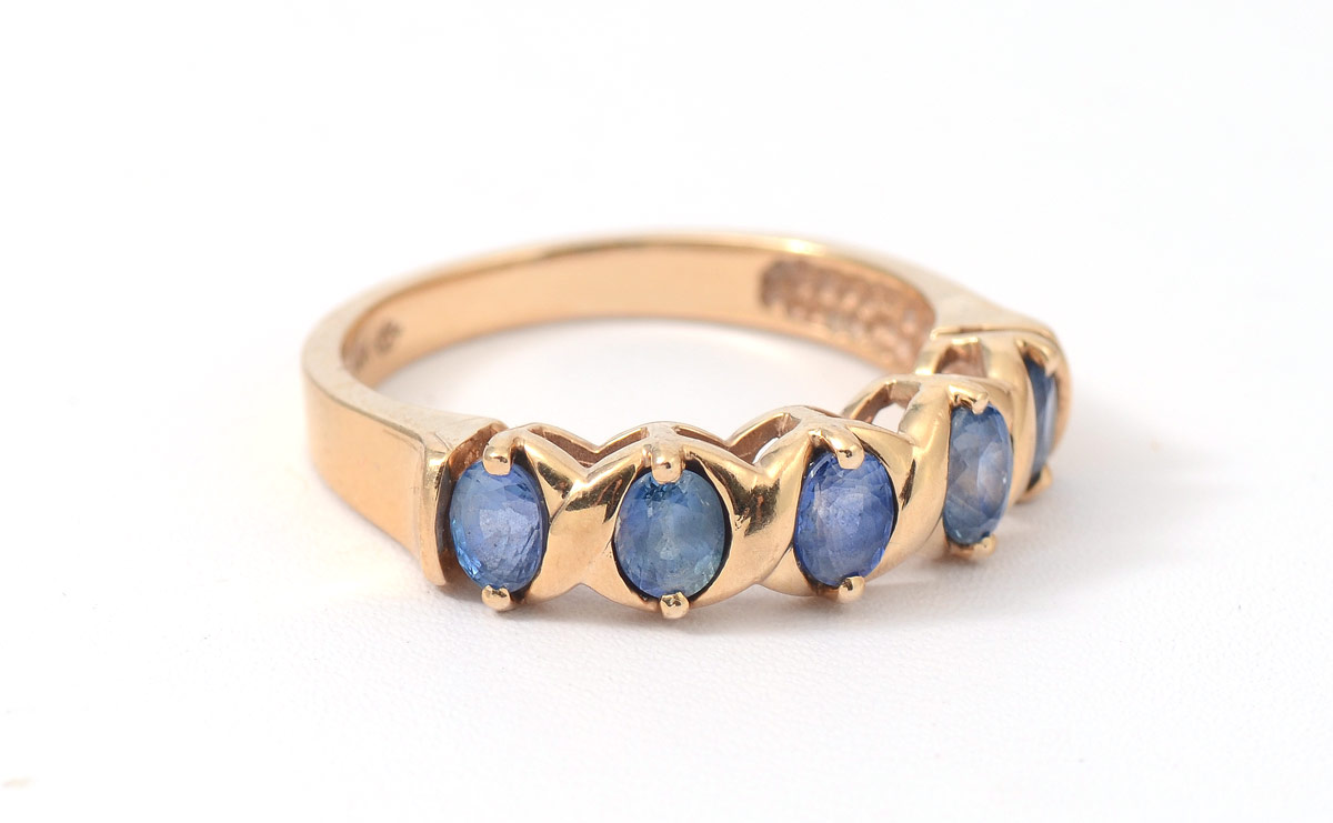 FIVE STONE SAPPHIRE RING: 14K yellow gold ring contains five oval mixed cut sapphires totaling approx. 1.25 Ct. Rated VS in clarity, vB in Hue, 4-5 in Tone and 3 in Saturation. The sapphires are prong set. Weight: 3.6 grams. Size: 9