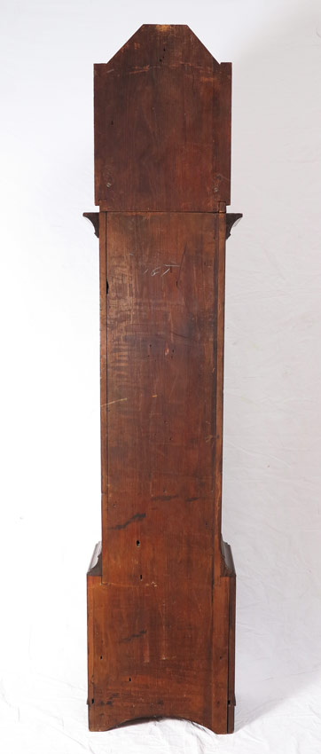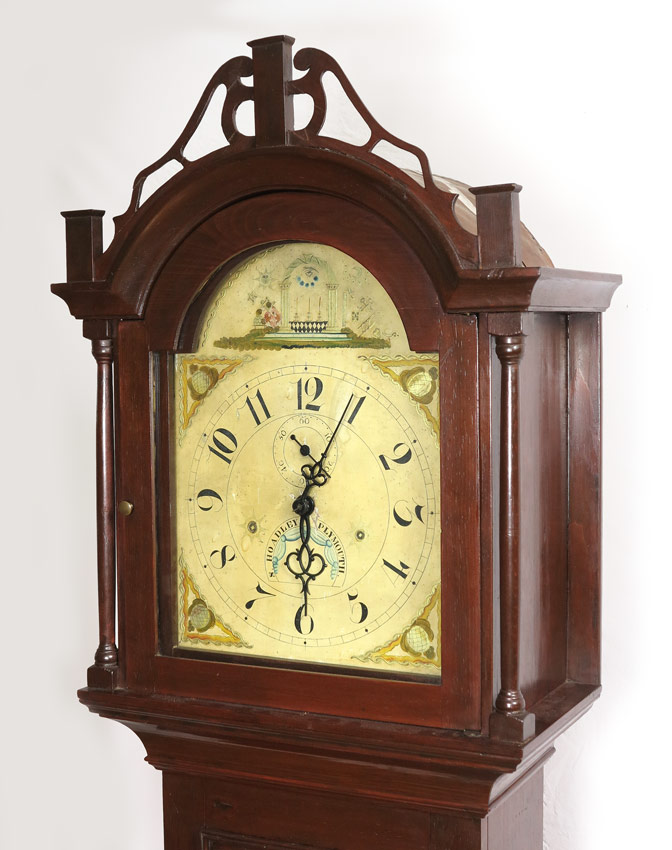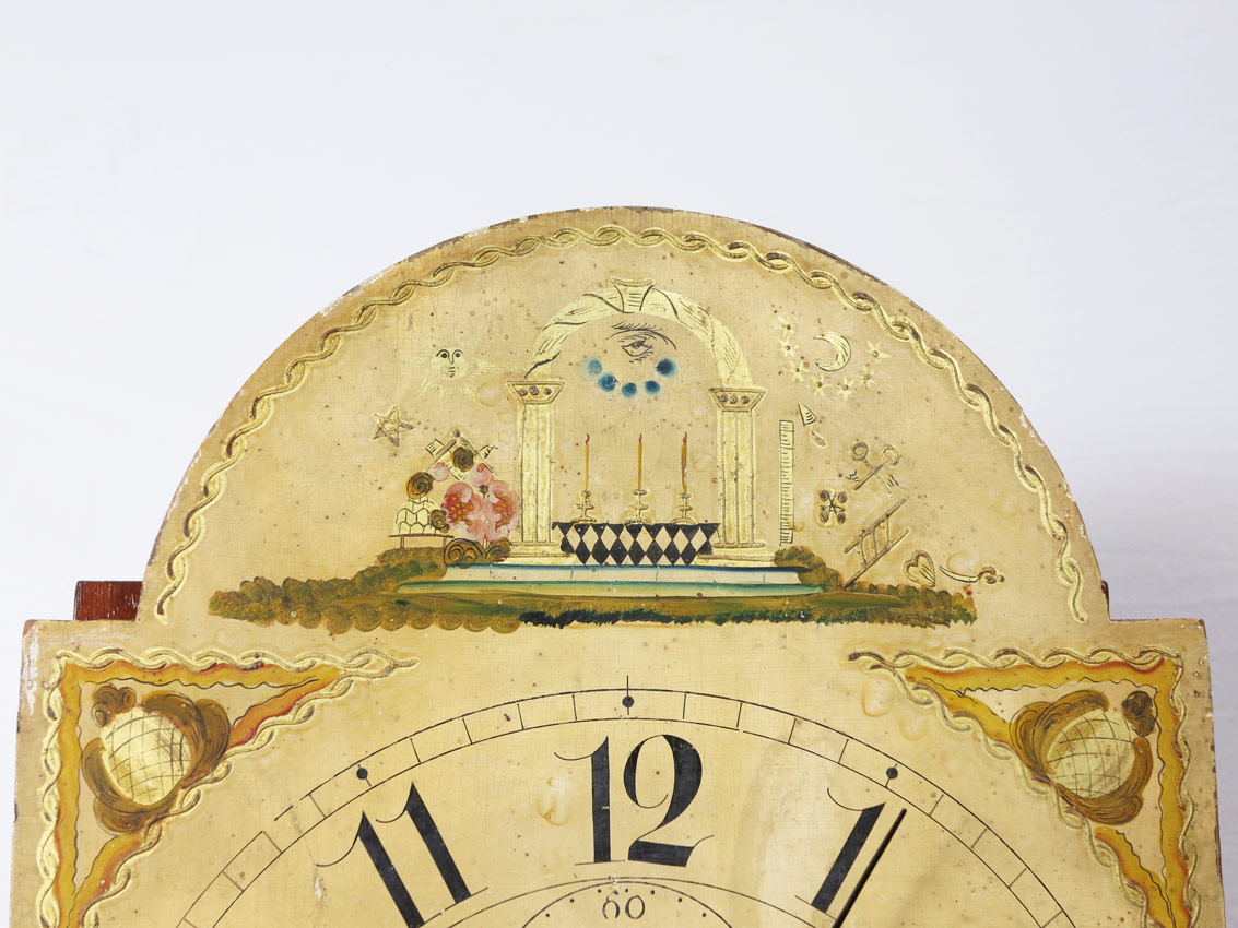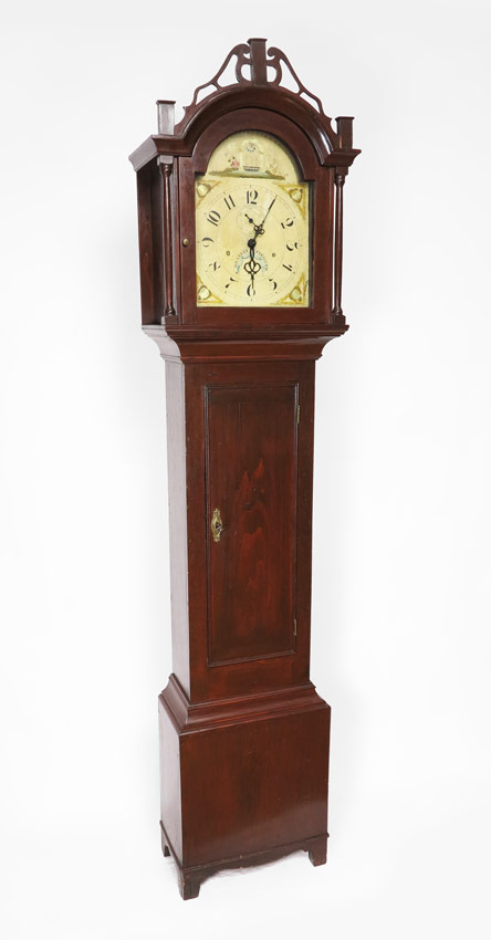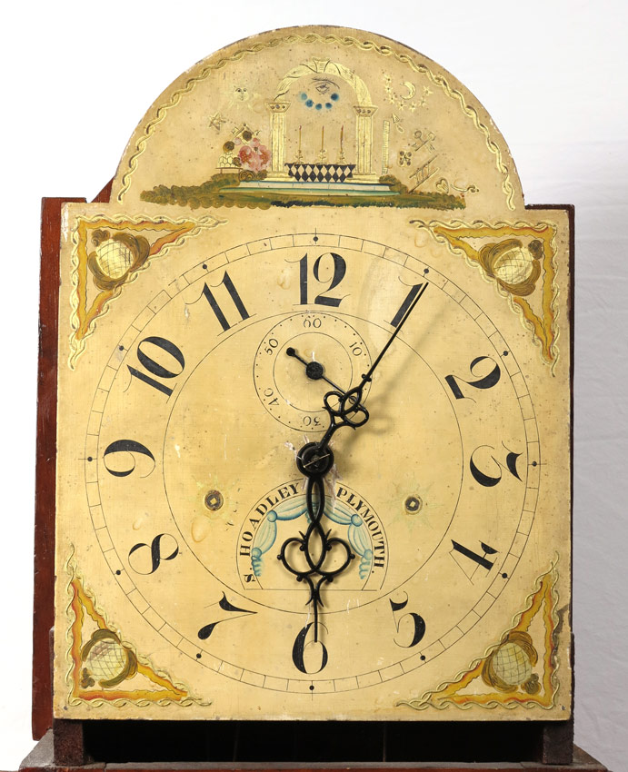 SILAS HOADLEY MASONIC TALL CASE CLOCK: Early 19th century, fret work crest, bonnet with 2 full columns. Bracket feet. Painted dial with masonic emblems in arched top of dial, marked S. Hoadley, Plymouth. Secondary date and second dials. Wooden gear time and strike movement. 86 1/4'' h. x 17 1/4'' x 9 1/2''.