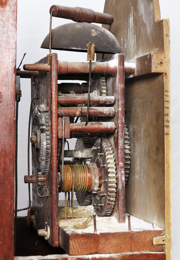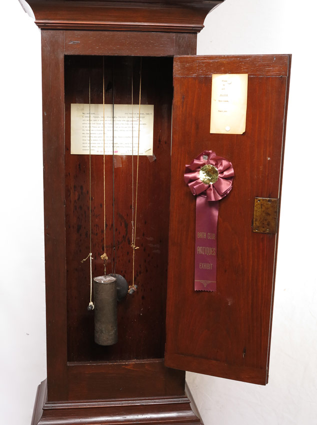 CONDITION: Craquelure to dial, top of bonnet has been replaced with vellum, sand has come out of one weight, chip to veneer on bonnet. Other wear consistent with age and use. We are unable to ascertain full functionality of movement.