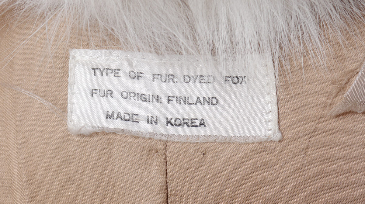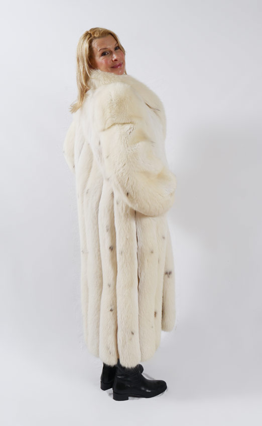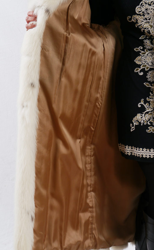 FULL LENGTH FOX FUR COAT: Full length dyed spotted fox to mimic ermine, made in Korea. Fur origin is Finland. Lining is Bemberg gold tone lining. Possibly size 12. Collar to hem approx. 52''. Shoulder to shoulder, 21''. Shoulder to shoulder, 26''.