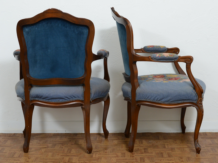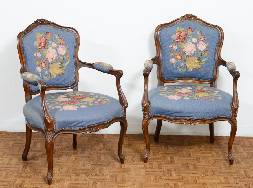 PAIR LOUIS XV STYLE WALNUT FAUTIUEL: Molded and carved open arm chais with cartouche shaped backs, backs and seats covered in floral needlepoint. 35 1/2''h. x 24''w. x 21''d.