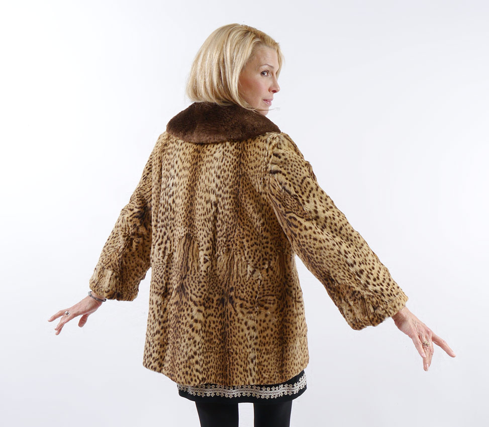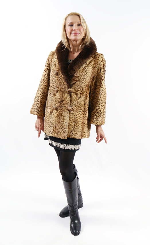 VINTAGE GEOFFREY CAT FUR JACKET: Spotted fur jacket with long brown fur collar, double rows of buttons. Approx. measurements are length from collar to hem, 28''. Shoulder to shoulder, 18'', shoulder to sleeve, 21''.