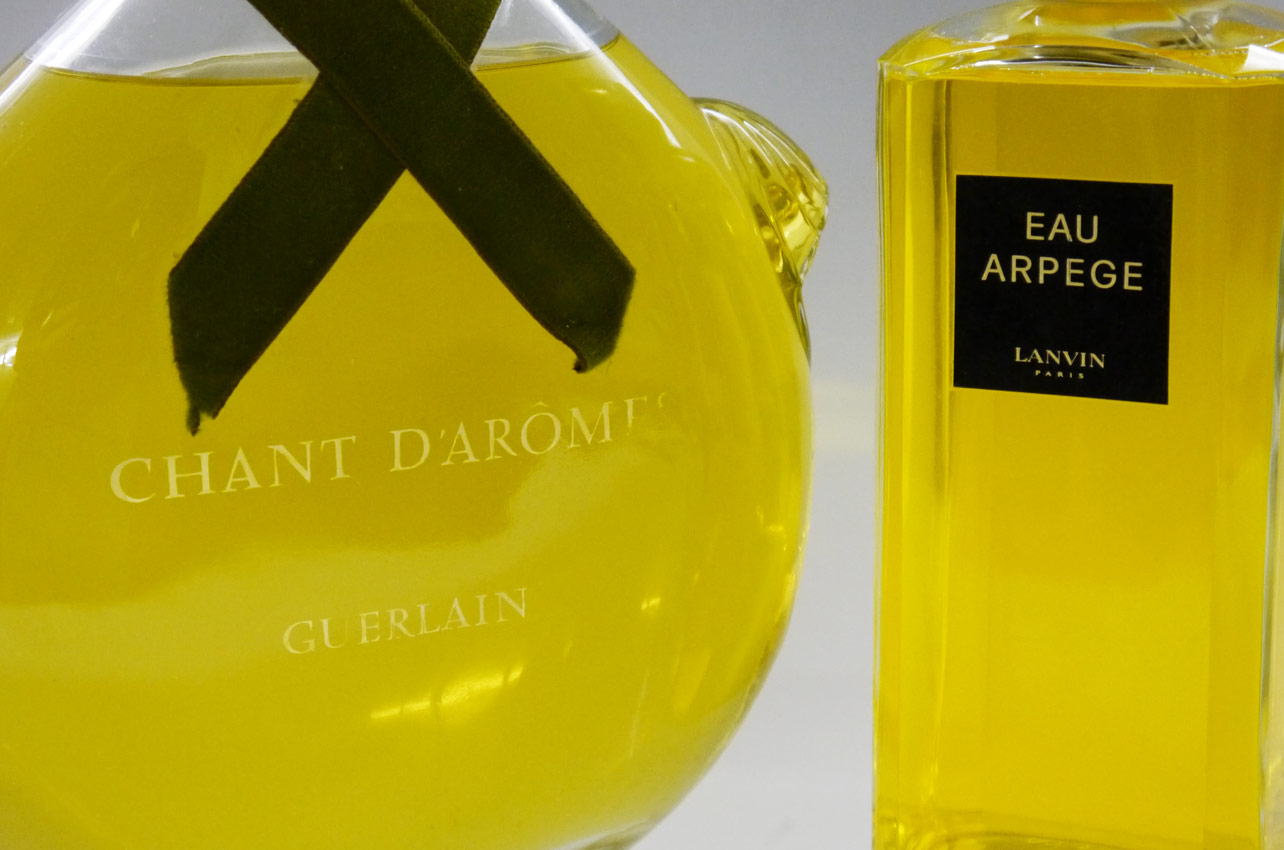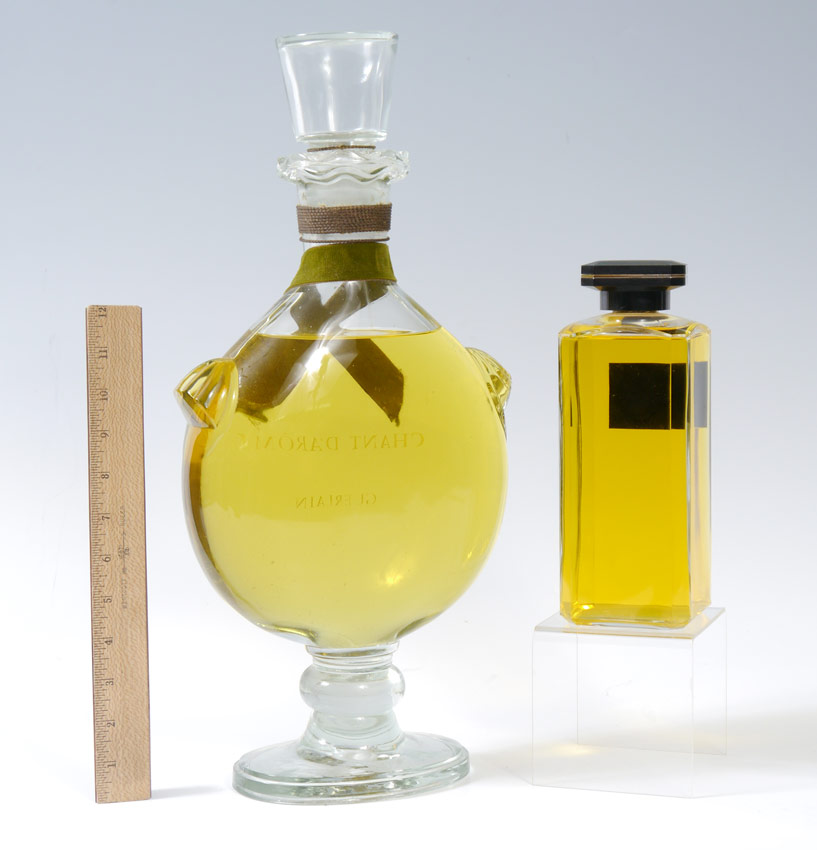 2 PIECE LANVIN & GUERLAIN FACTICE PERFUME BOTTLES: To include 1) ''Eau Arpege'' by Lanvine Paris, 9'' h. x 3 3/8'' x 3 3/8''. 2) ''Chante D'Aromes'' by Guerlain, chip to base, wear to lettering, 18 1/2'' h. x 9''.