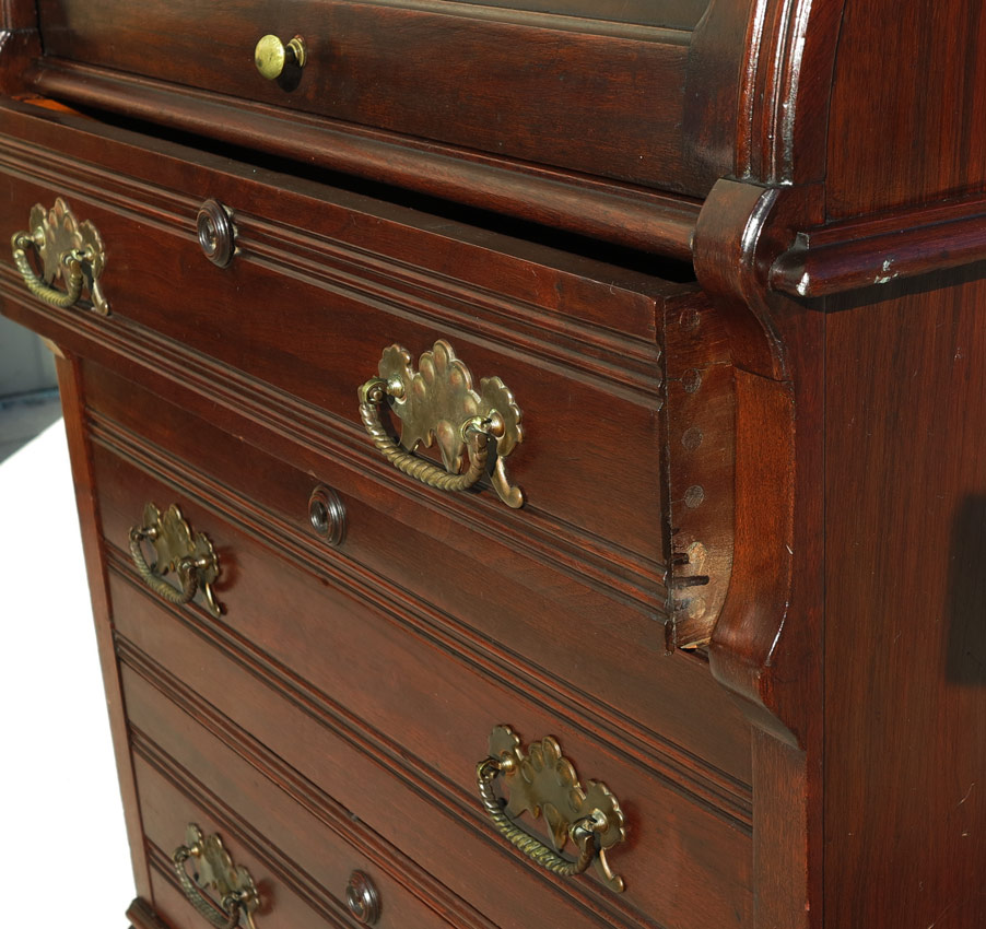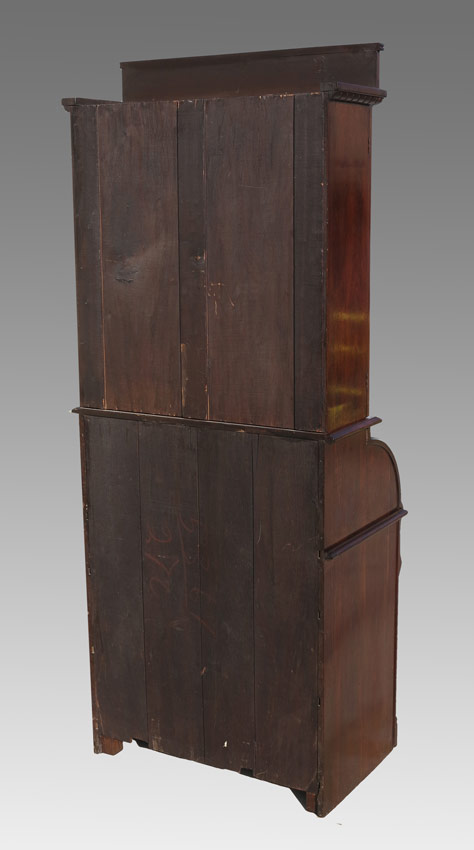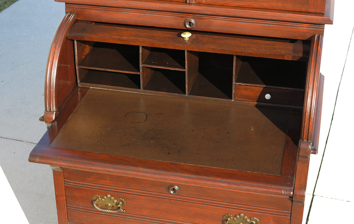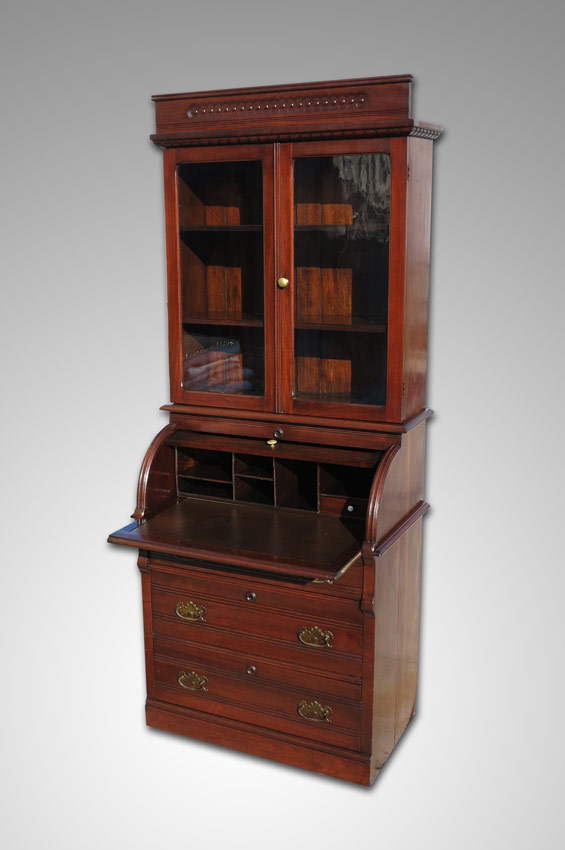 SECRETARY ROLL TOP DESK: Carved crest, top with 2 glass doors and 2 shelves. Base with roll top secretary, interior pigeon holes, single drawer and leather writing surface. 3 graduated full length drawers. 78'' h. x 32'' x 19''.