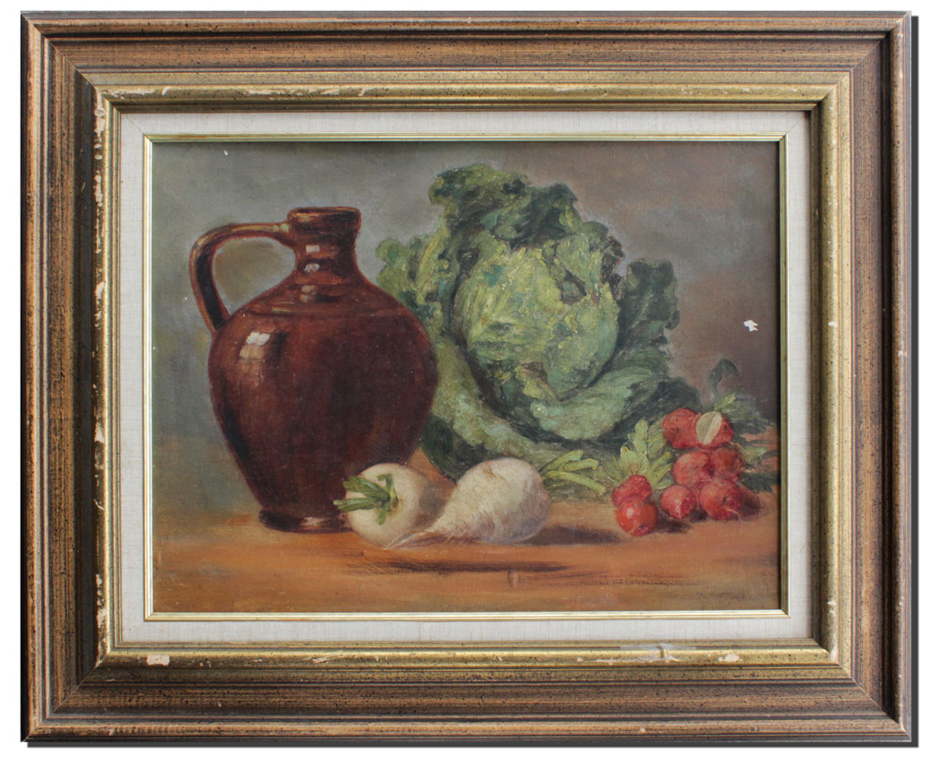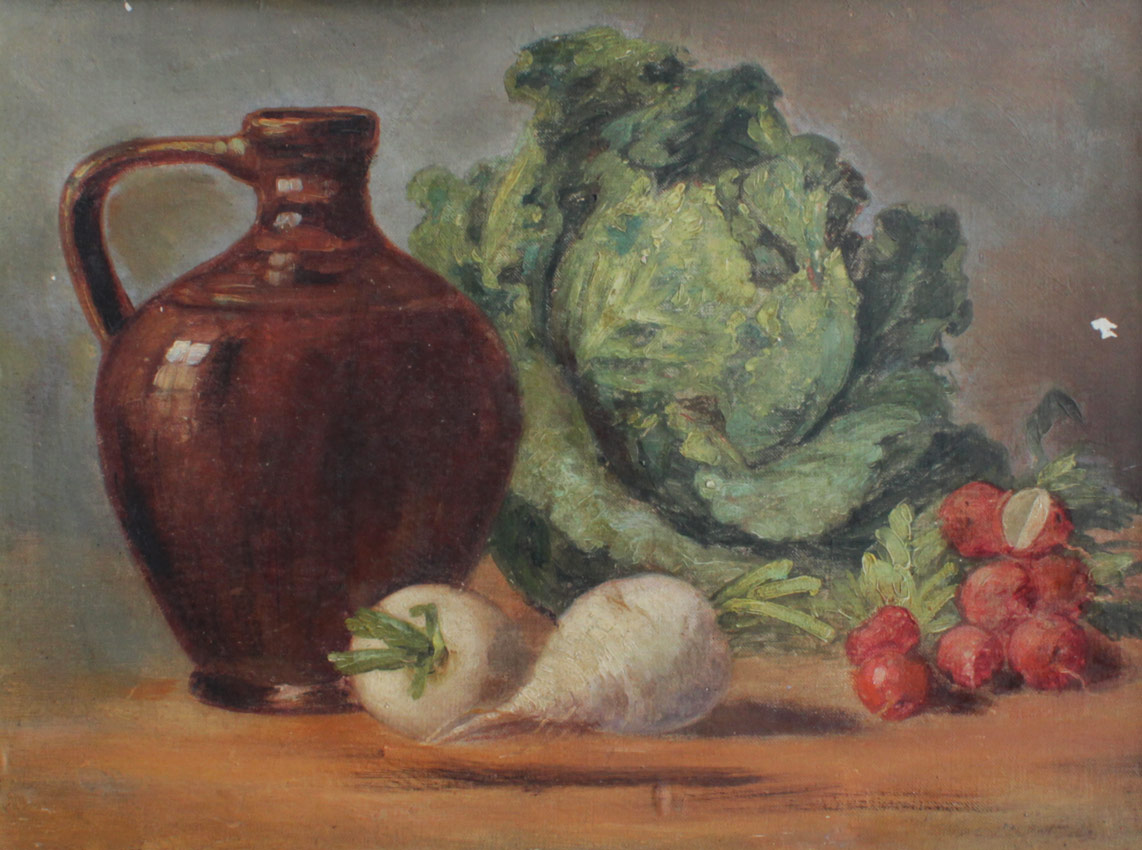 GOOD ILLEGIBLY SIGNED STILL LIFE PAINTING: Oil/Canvas laid down on board, 14 3/4'' x 19 3/4'', possibly dated 1916?, later gilded frame with scattered wear, 22 1/4'' x 27 1/4''.