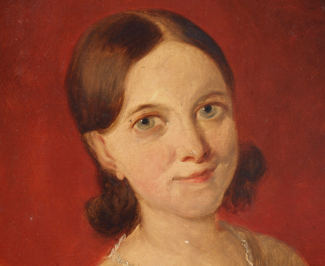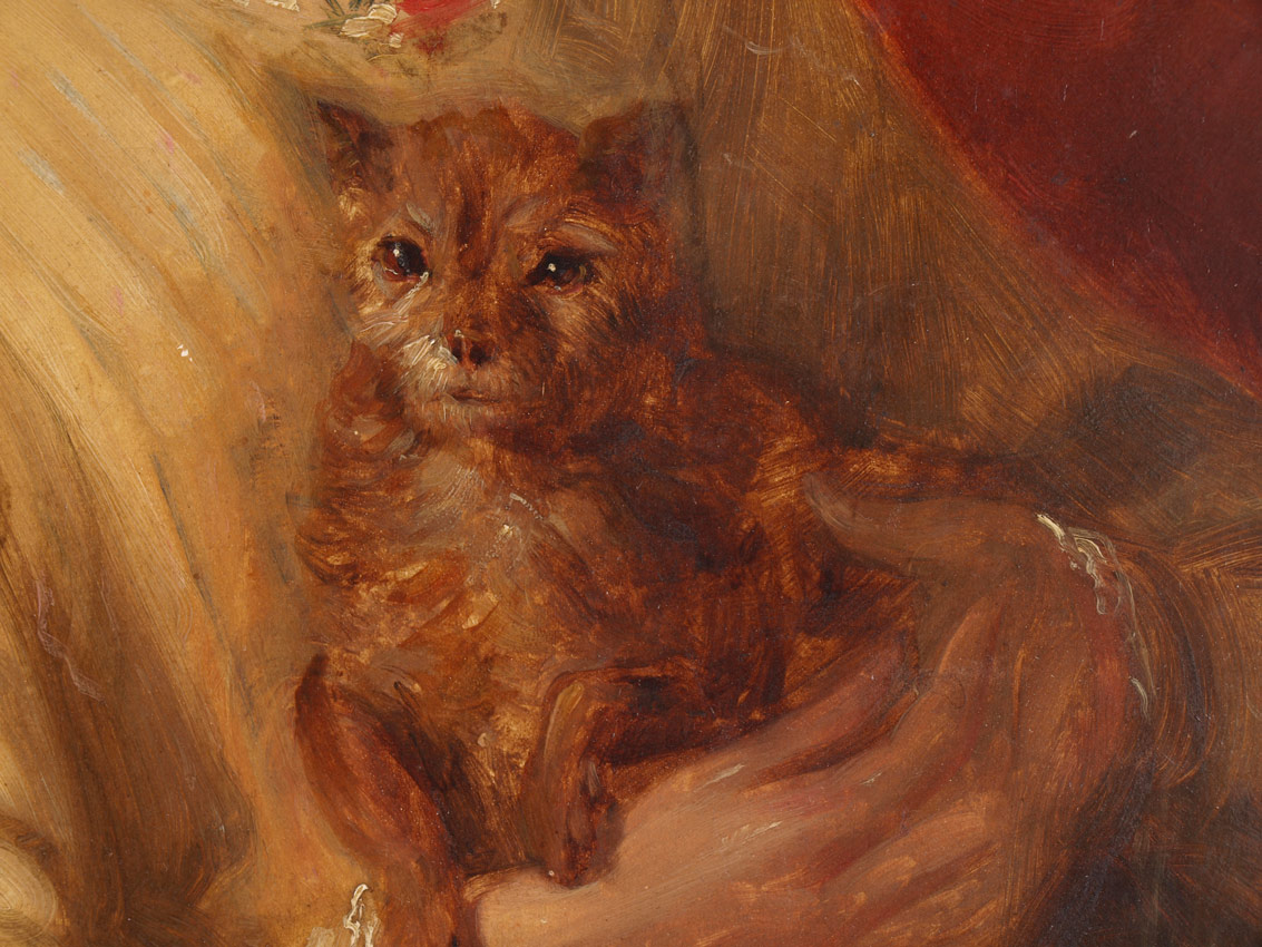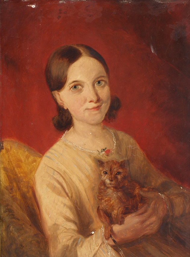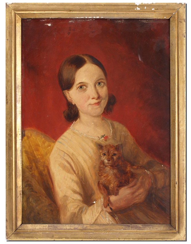 PAINTING YOUNG GIRL WITH DOG, 19TH CENTURY: 16 1/4'' X 12 1/4'', no visible signature, encased in gilded liner with wear, 18'' x 14''.