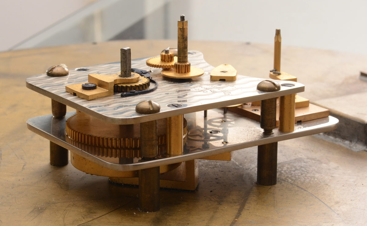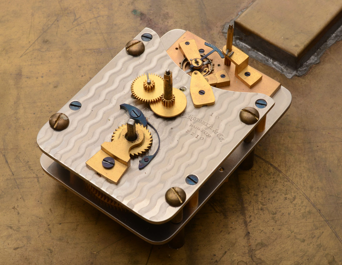 EDWARD CALDWELL GALLERY WALL CLOCK: Circular bronze case with faux slate and ormolu finish. Enamel dial marked Edward F. Caldwell with what appears to be some attempt at restoration to the marking, poorly done. Applied Roman numerals. E. Howard movement. Key in office. 3 1/4'' x 18'' dia.