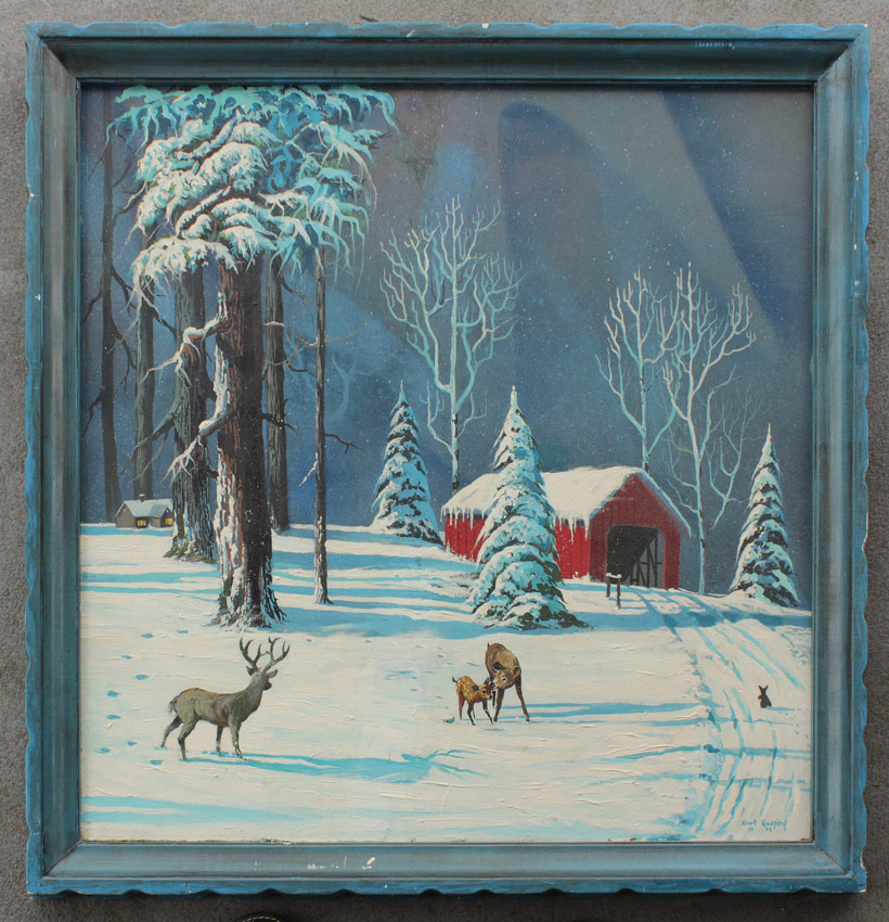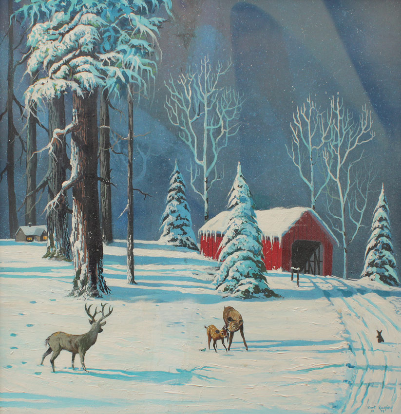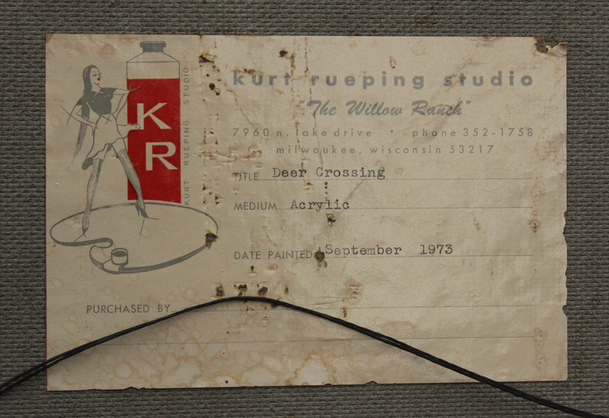 RUEPING, Kurt, (American, ): Deer Crossing, Acrylic/Masonite, 30'' x 30'', signed lower right, dated 1973, original artist's label with title affixed verso, encased in custom carved and painted frame with wear, 34'' x 34''.