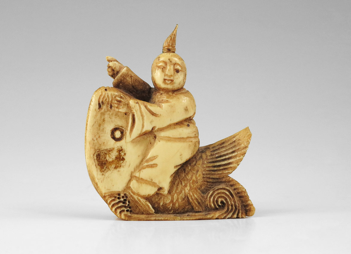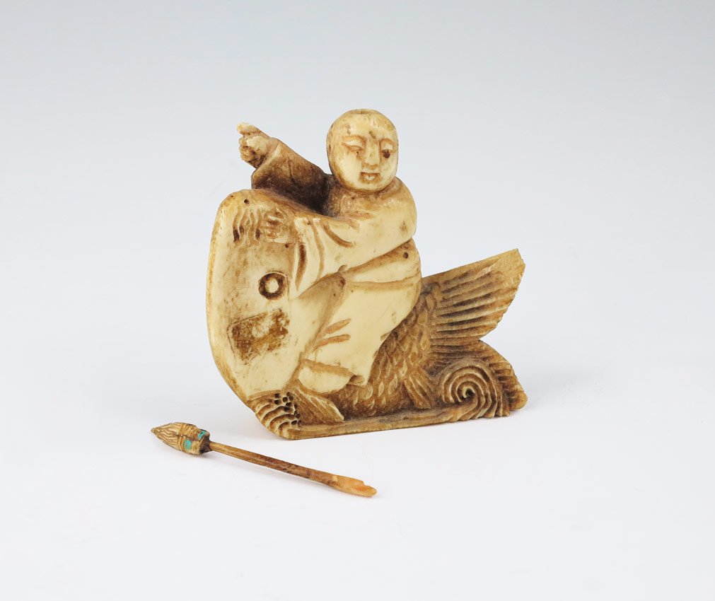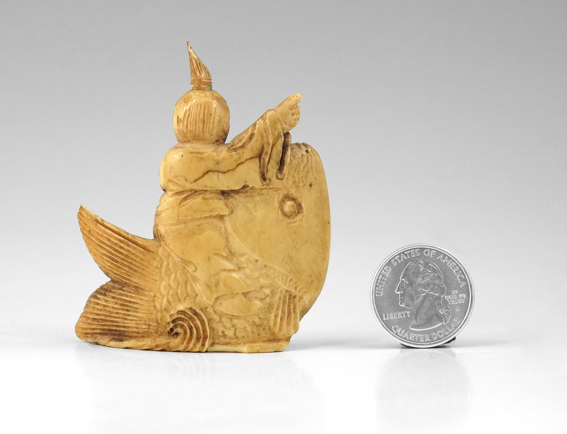 CARVED MASTODON IVORY FIGURAL SNUFF BOTTLE: Figural man riding on fish, original spoon intact. Measures 2 7/8'' h. x 2 3/8''.