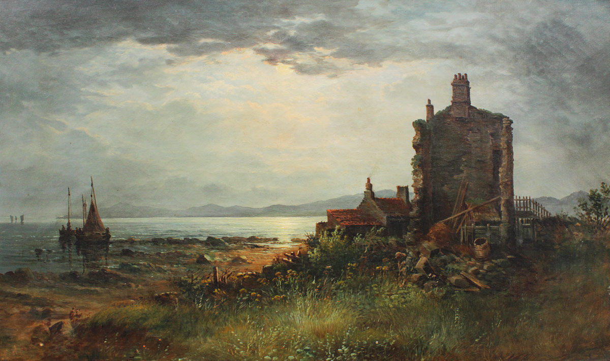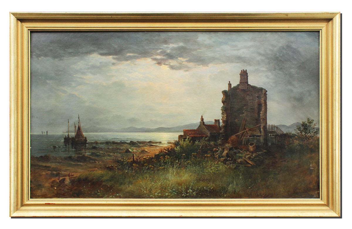 PORTEOUS, William, (British, 1880-1882): Nocturnal Moonlit Shoreline Scene with Boats and Cottage, Oil/Canvas, 16 1/4'' x 27 1/4'', signed lower left, gilded frame with wear 18 1/2'' x 29 1/2''.