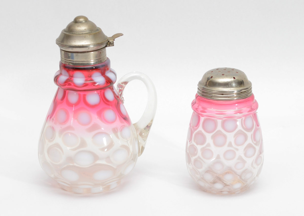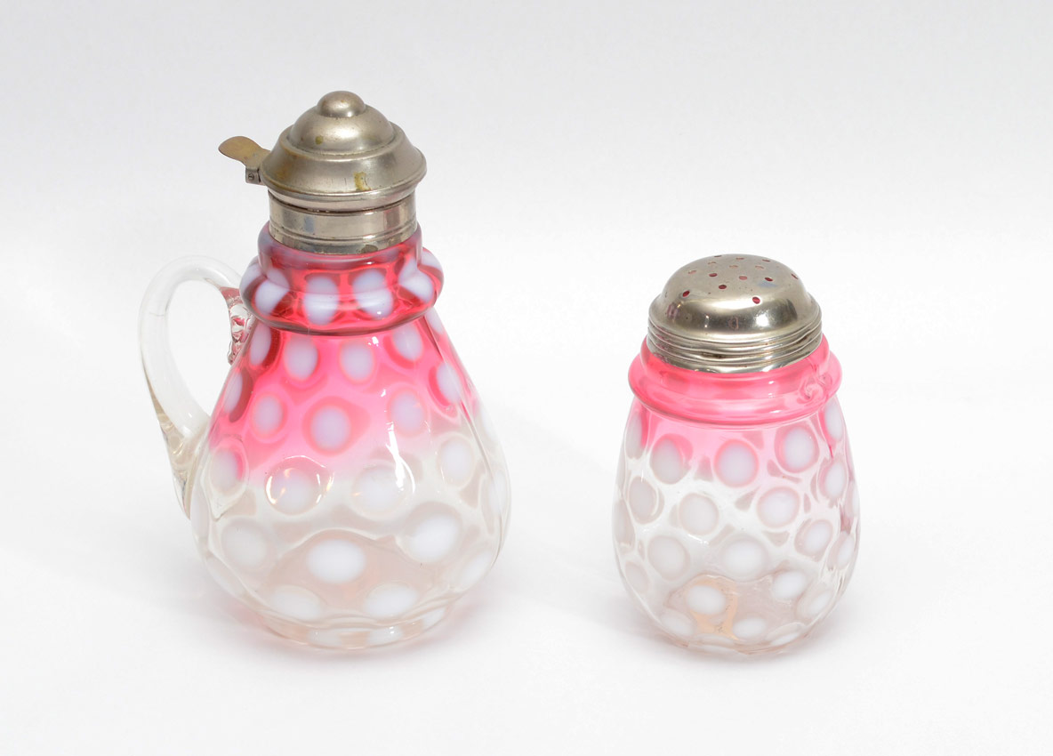 CRANBERRY GLASS COIN SPOT SYRUP AND MUFFINEER: Matching cranberry fading to clear with white dots, syrup with hinged lid and applied handle, 7''h. Shaker with screw top, 5''h.