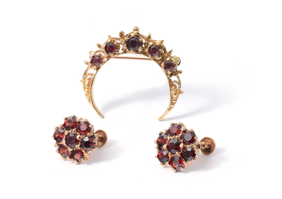 14K GARNET BROOCH & EARRING SET: 14K yellow gold half moon shaped Victorian revival brooch and earring set contains 19 round mixed cut garnets. Weight: 3.00 Ct. Approx. The garnets are prong set. Brooch has bar pin closure. The earrings have French screw back closures. Weight: 9.4 grams.