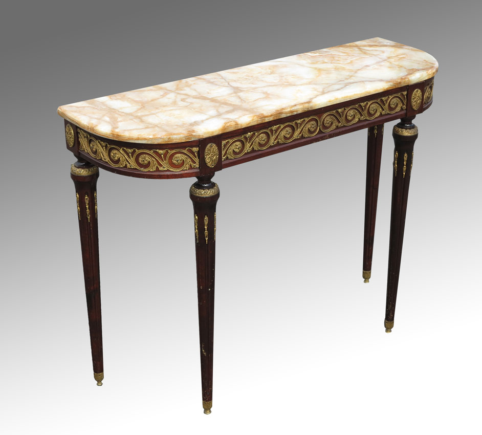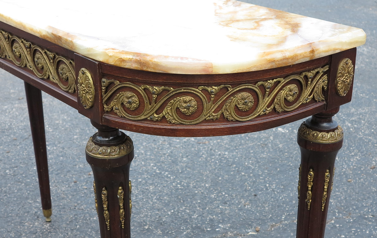 LOUIS XVI STYLE ONYX TOP DEMI CONSOLE TABLE: Variegated onyx top, base with applied foliate scroll & medallion applied ormolu decoration. Tapered and fluted legs with ormolu decoration. 28 1/2'' h. x 38'' x 12 1/4''.