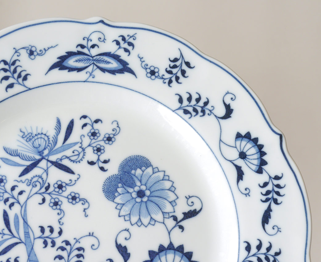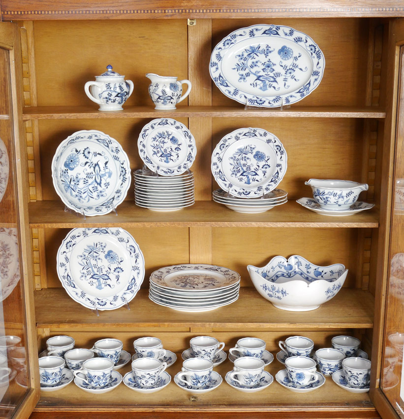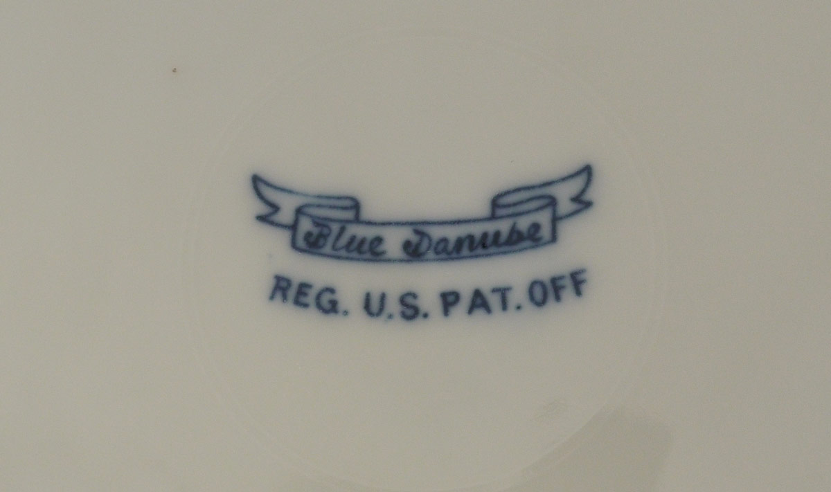 BLUE DANUBE CHINA: Approx. 61 pieces to include 8 dinner plates (10''), 13 bread or dessert plates (6 1/2''), 4 soup bowls, 16 tea cups, 14 saucers, a 12'' platter, open vegetable bowl, square salad serving bowl, gravy with attached underplate, cream pitcher and sugar.