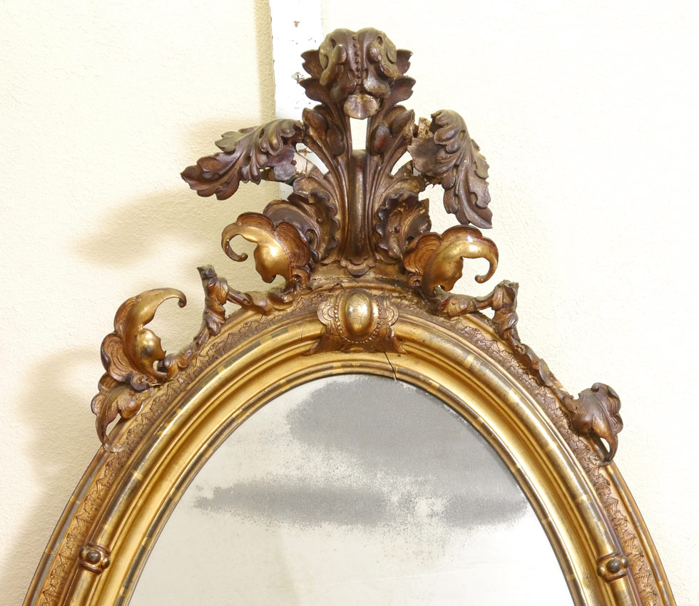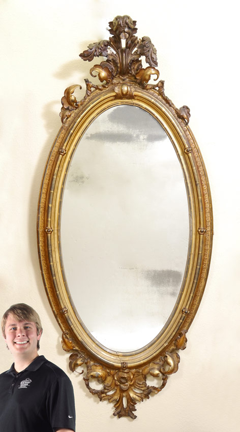7 FT AMERICAN NEW YORK ROCOCO REVIVAL GILDED MIRROR: A grand wall mirror with exaggerated foliate spray crest, carved frame, foliate lower crest. 84'' h. x 39'' x 7''.