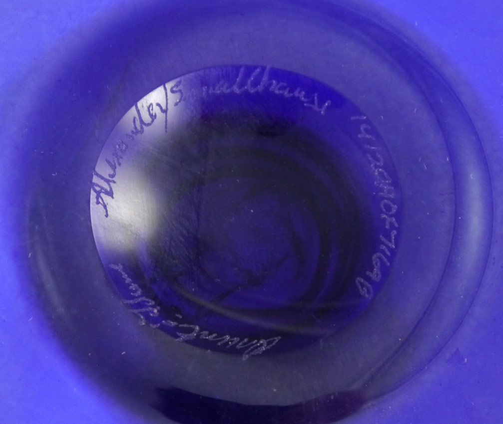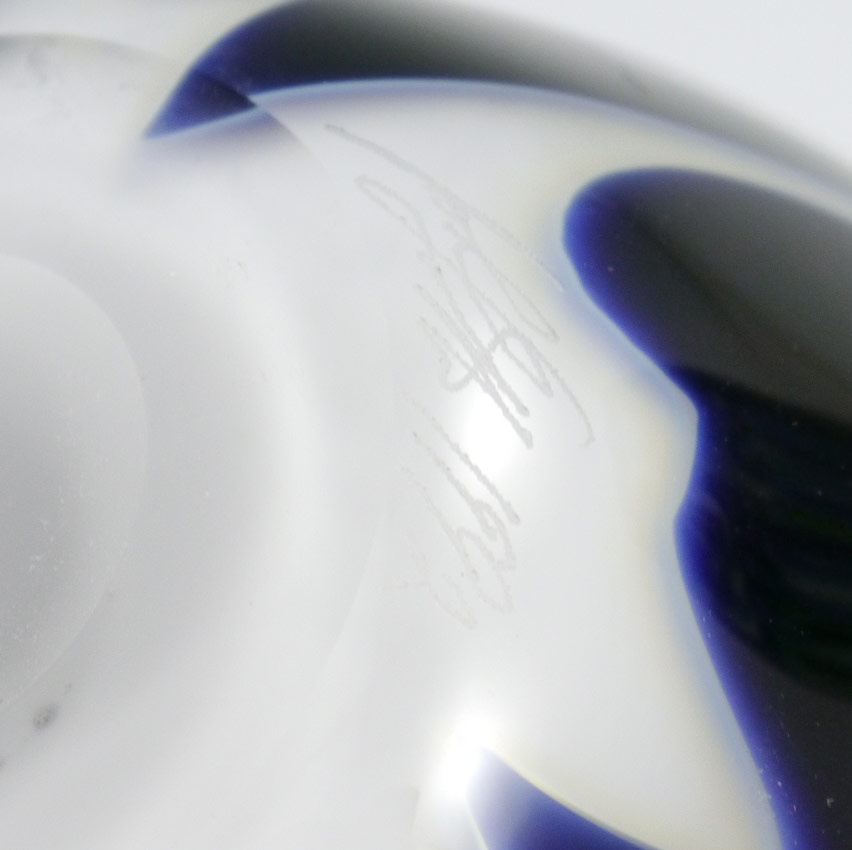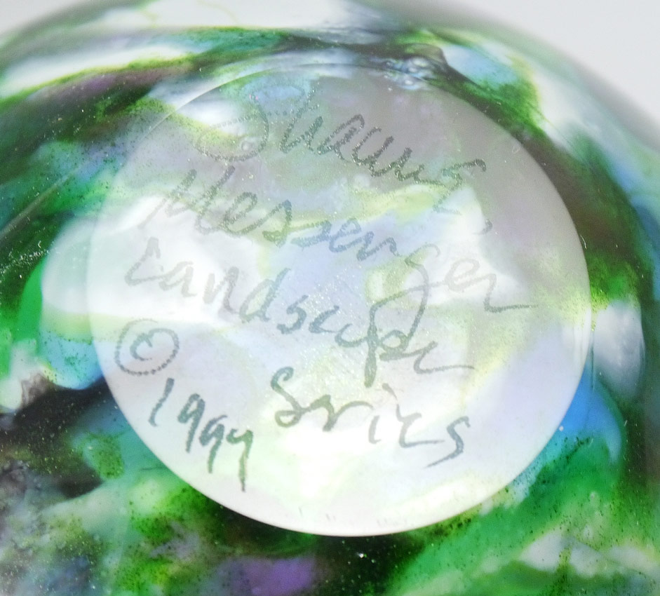 3 PIECE ART GLASS COLLECTION: 3 pieces total to include 1) Orient & Flume floral motif footed vase. Signed on base 9 1/4'' h. x 5 1/2''. 2) Shawn Messenger ''Landscape'' art glass vase, signed and dated 1994. 9 1/4'' h. x 5 1/4''. 3) Unsigned vase with flared rim, 7 7/8'' h. x 5 1/4''.