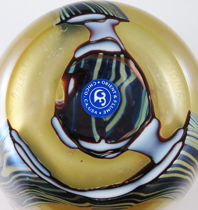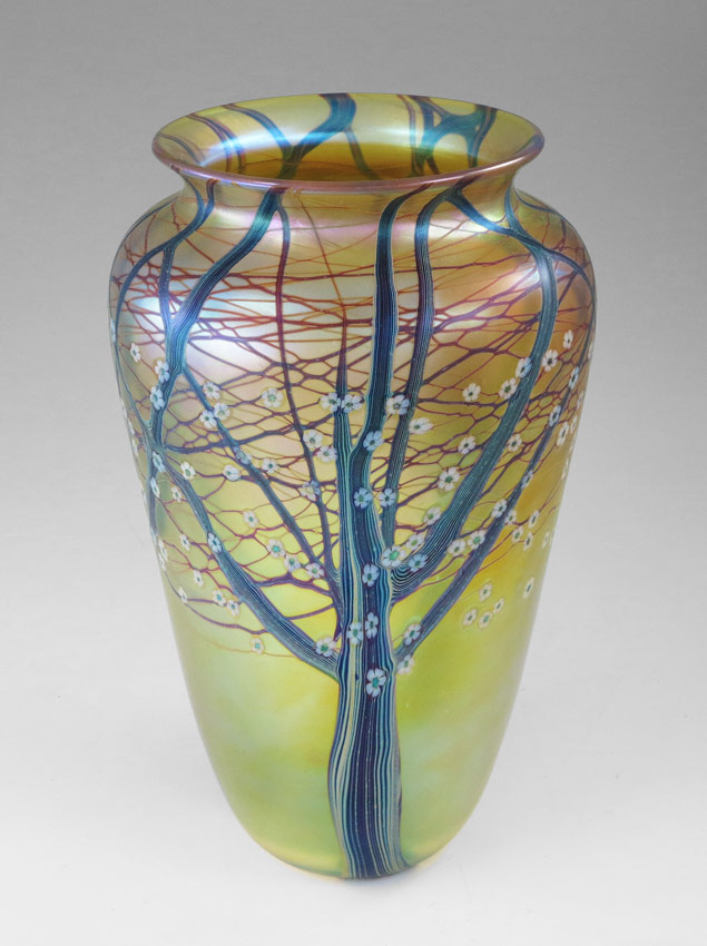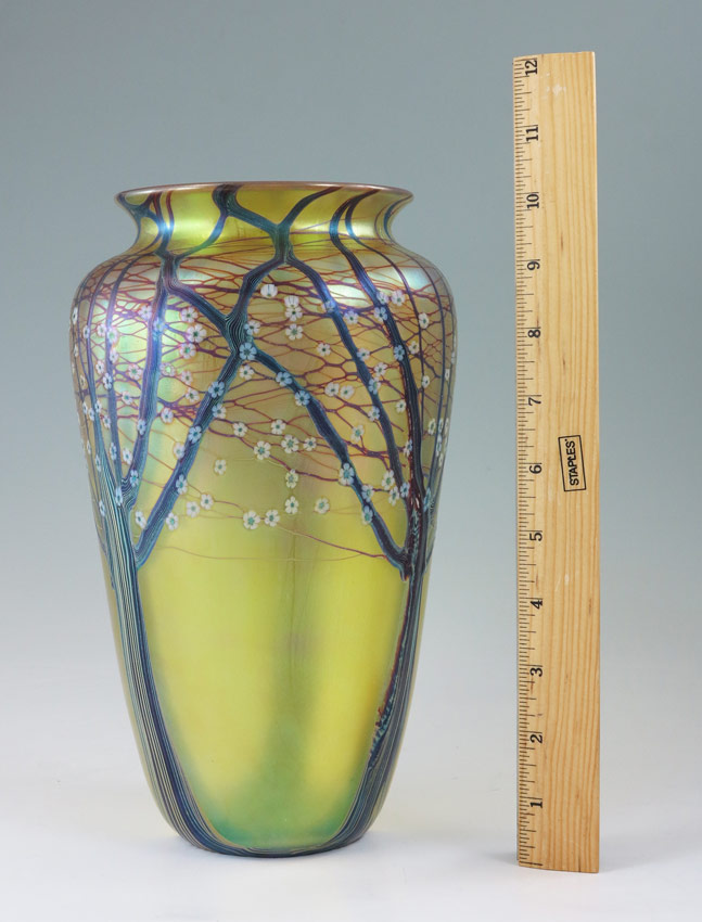 ORIENT & FLUME HAWTHORNE ART GLASS VASE: Features 3 Hawthorne trees on iridescent yellow background with white millefiori flowers. Signed Orient & Flume with I.D. number and original paper label. Measures 10 1/4'' h. x 6'' dia.