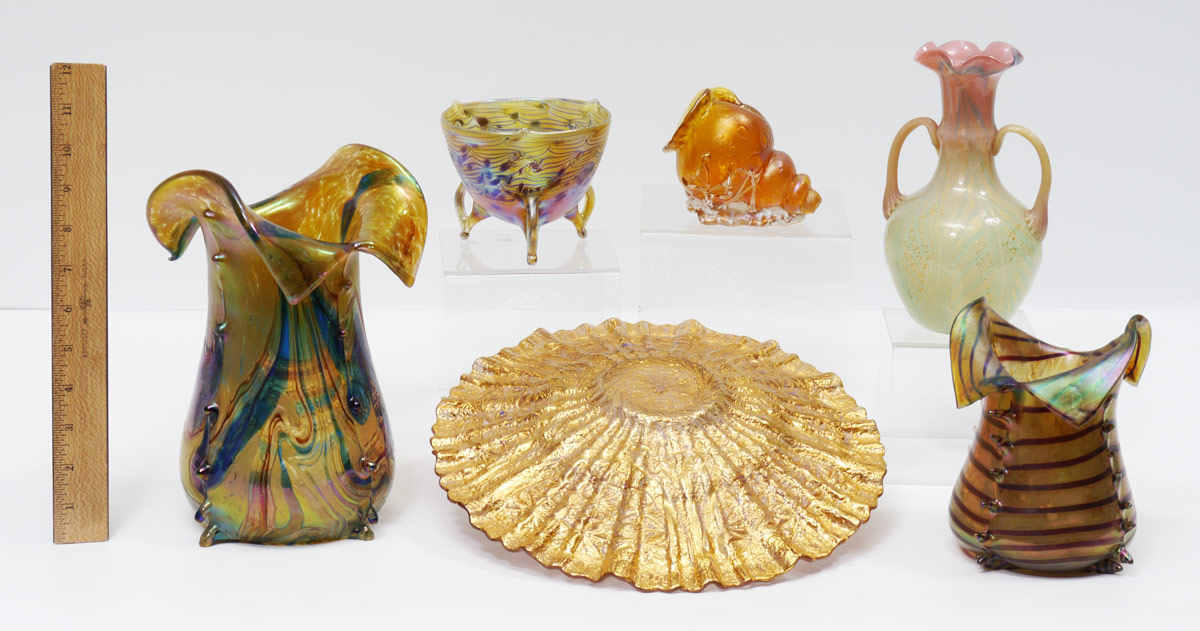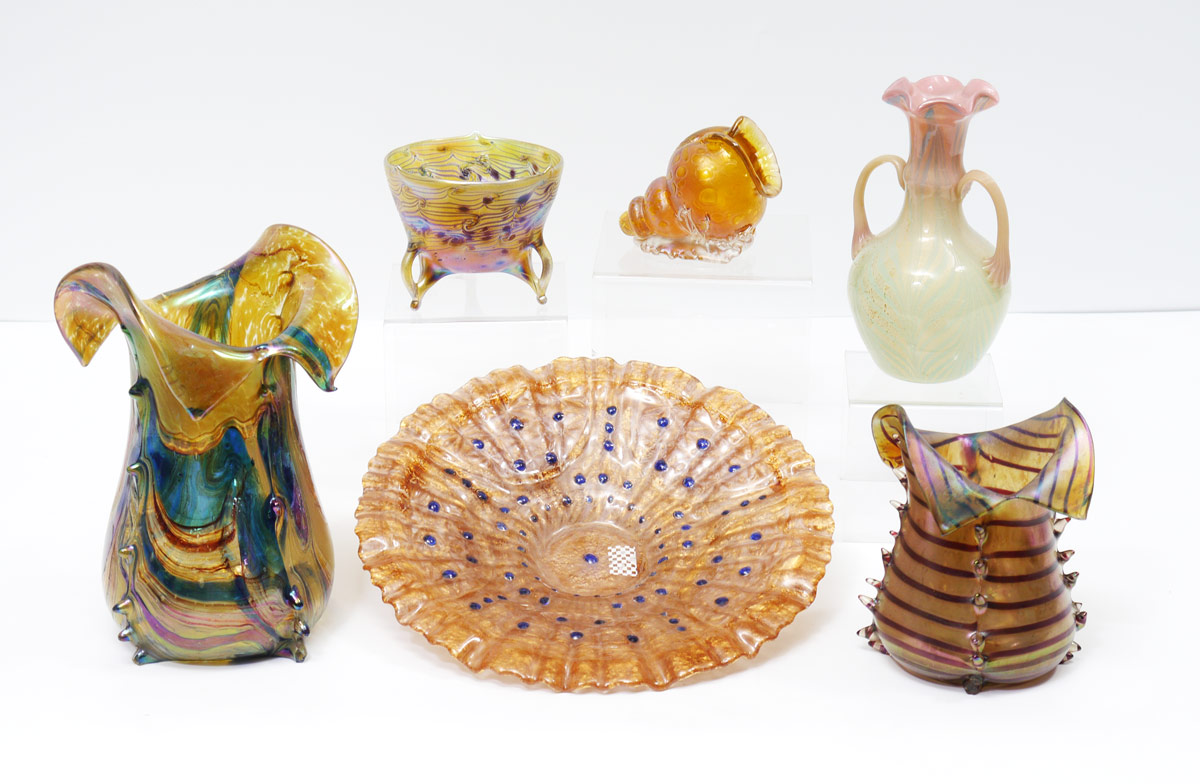 6 PIECE EUROPEAN ART GLASS: 6 pieces to include 1) Scalloped bowl with gilt decoration and applied blue glass beading, 12'' dia. 2) Double handle vase, 8'' h. 3) Sea shell form vase, 4'' h. 4) Tri-footed bowl, 3 3/4'' x 5''. 5) Spiked body vase with rolled rim, 6 1/2'' h. 6) Larger spiked body vase with rolled rim, 9 3/4'' h.