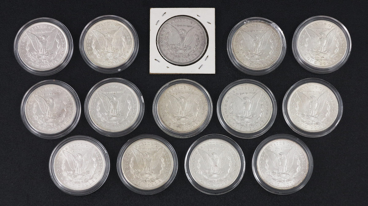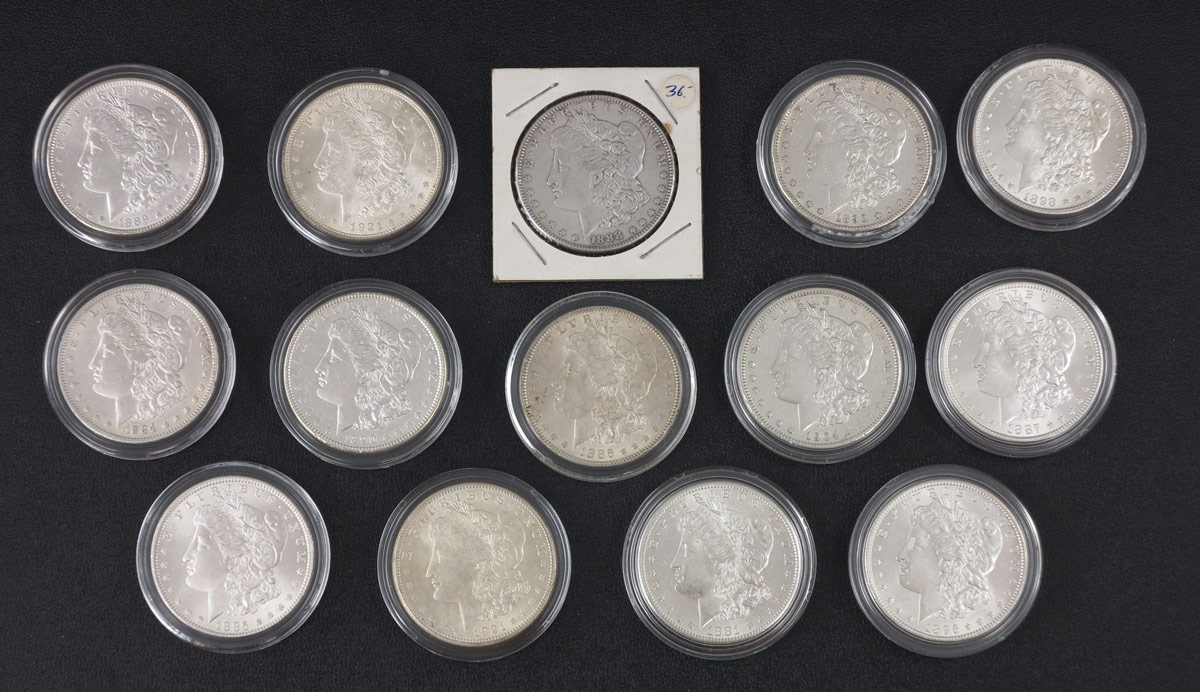 14 PHILADELPHIA & SAN FRANCISCO SILVER MORGAN DOLLARS: 14 coins total, 11 Philadelphia mint to include 1884, 1885, 1886, 1887, 1888, 1889, 1890, 1896, 1898, 1904, 1921. 3 San Francisco to include 1881, 1890, 1921. Ungraded.