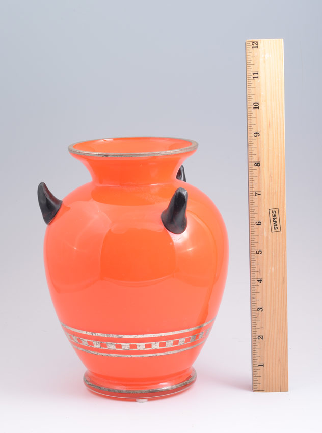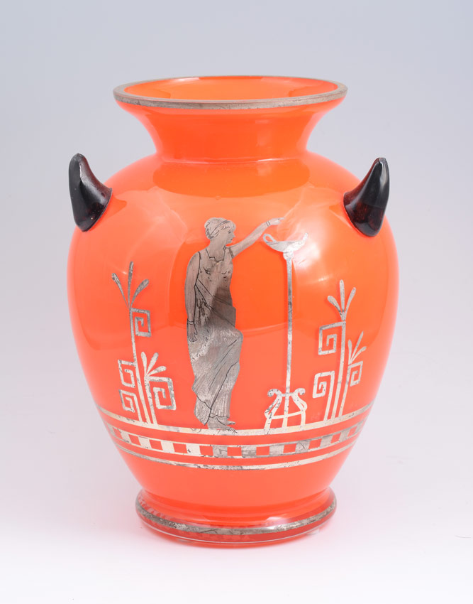 CZECH SILVER OVERLAY ART GLASS VASE: Classic Czech orange and black with silver Roman Greco style design. 8 1/2'' h. x 6 1/2''.