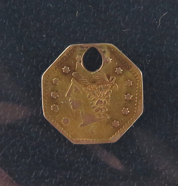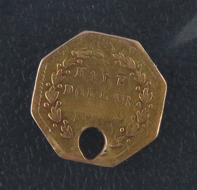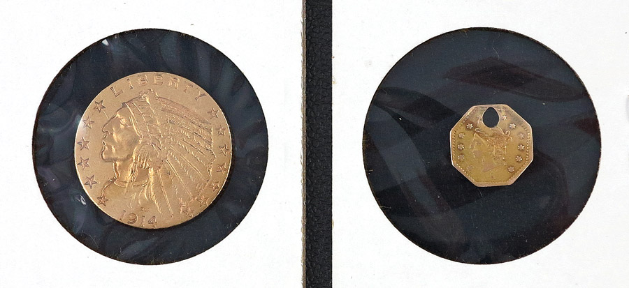 1914-S GOLD $5 AND 1864 FRACTIONAL HALF DOLLAR COINS: 2 pieces to include 1) 1914-S $5 gold half eagle. 2) 1864 California gold fractional half dollar with hole at top. Both ungraded.