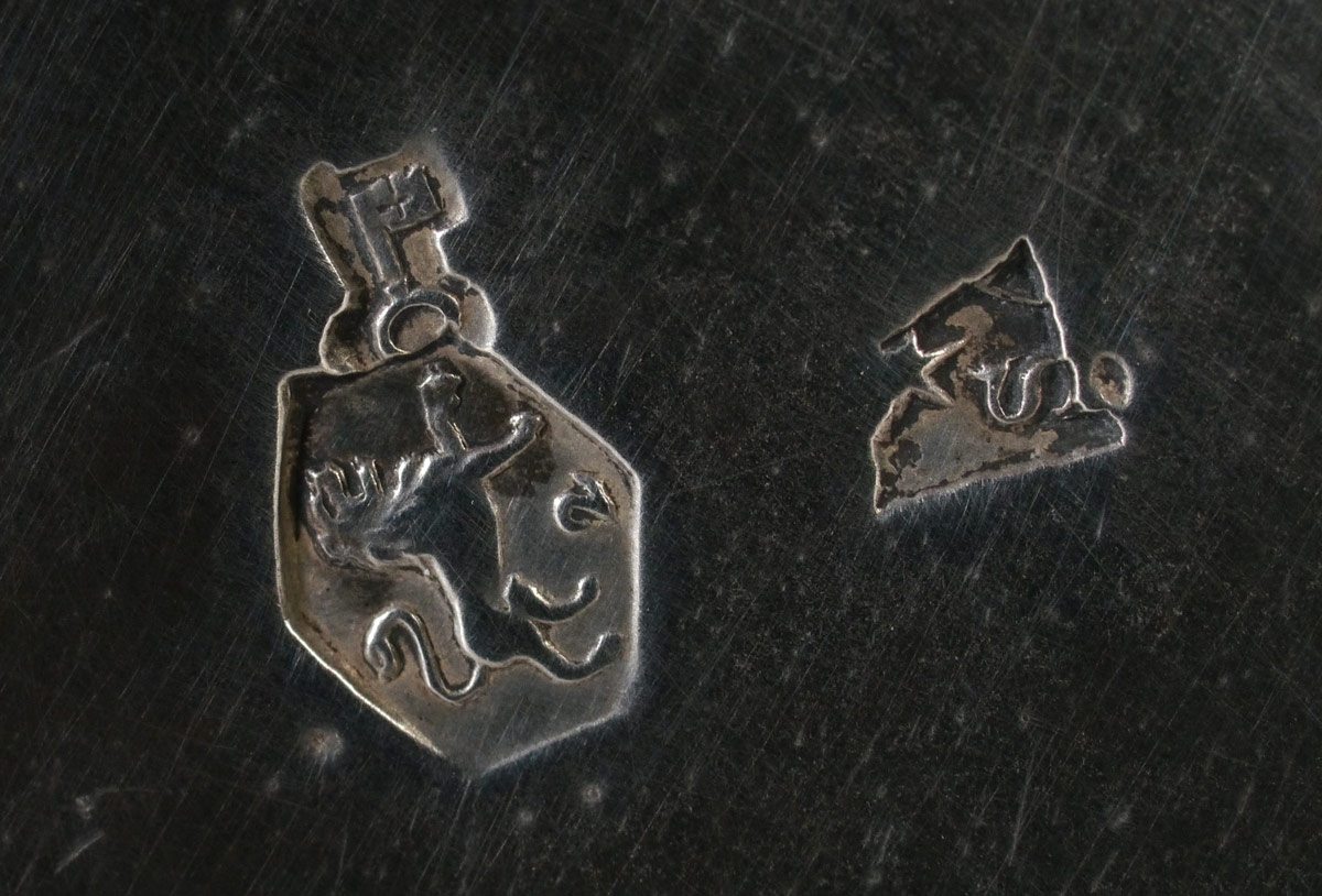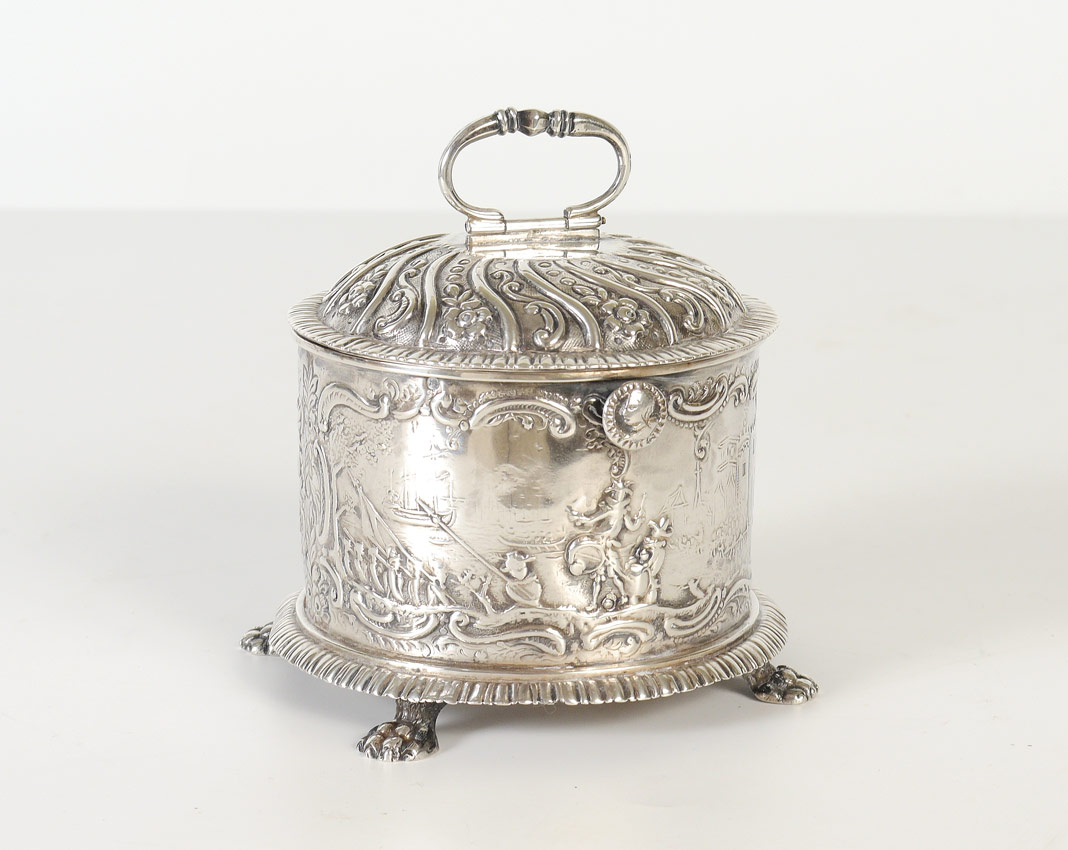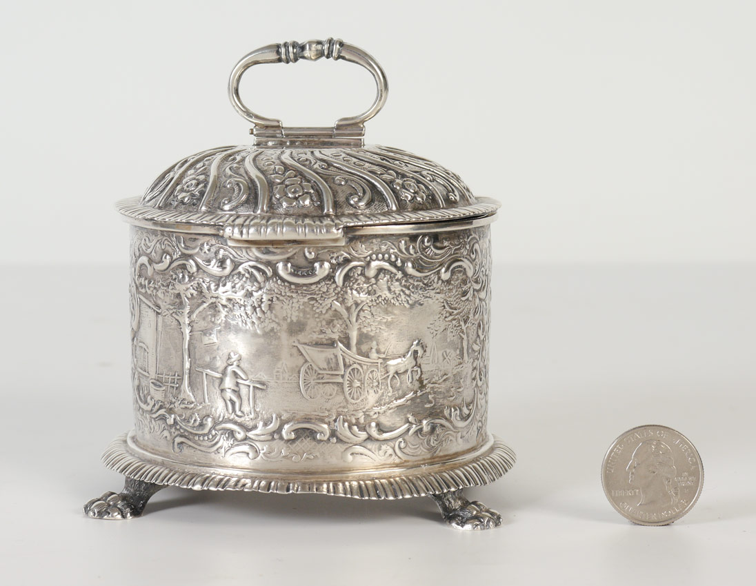 DUTCH SILVER REPOUSSE COVERED BOX: Hinged lid with handle and push button closure, body with repousse scenes of boats, castle, horse and wagon, all with figures. On 4 paw feet. Hallmarked with Dutch export silver mark, unknown makers mark. 3 5/8'' h. x 4 3/4'' dia. Approx. 8.4 troy oz.
