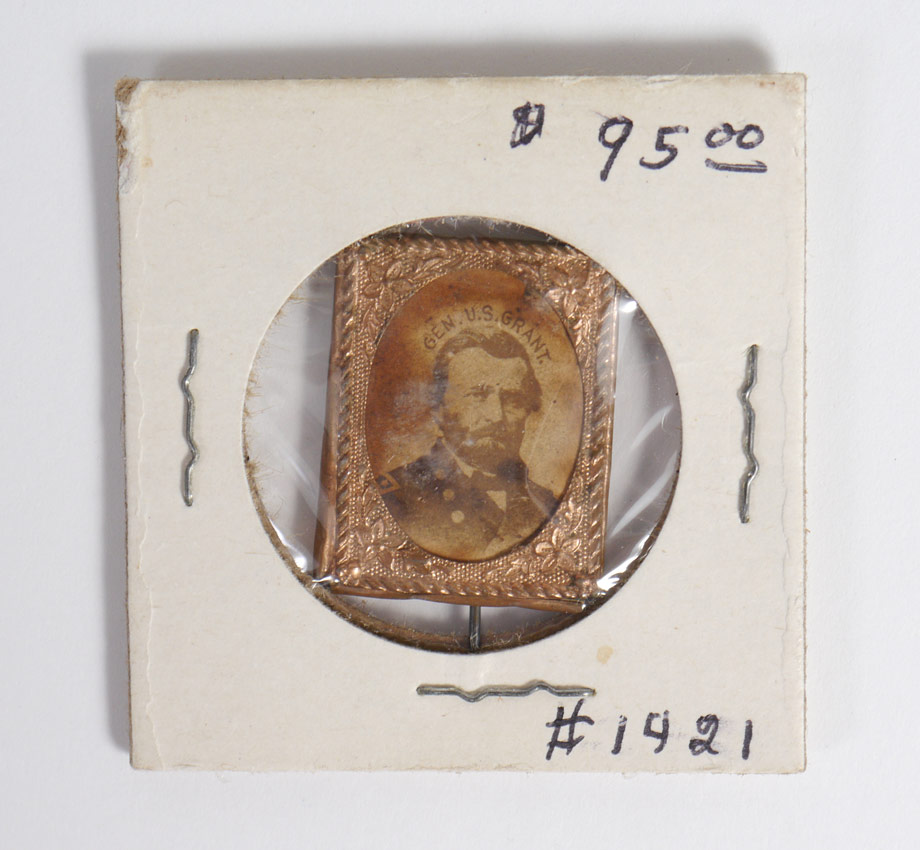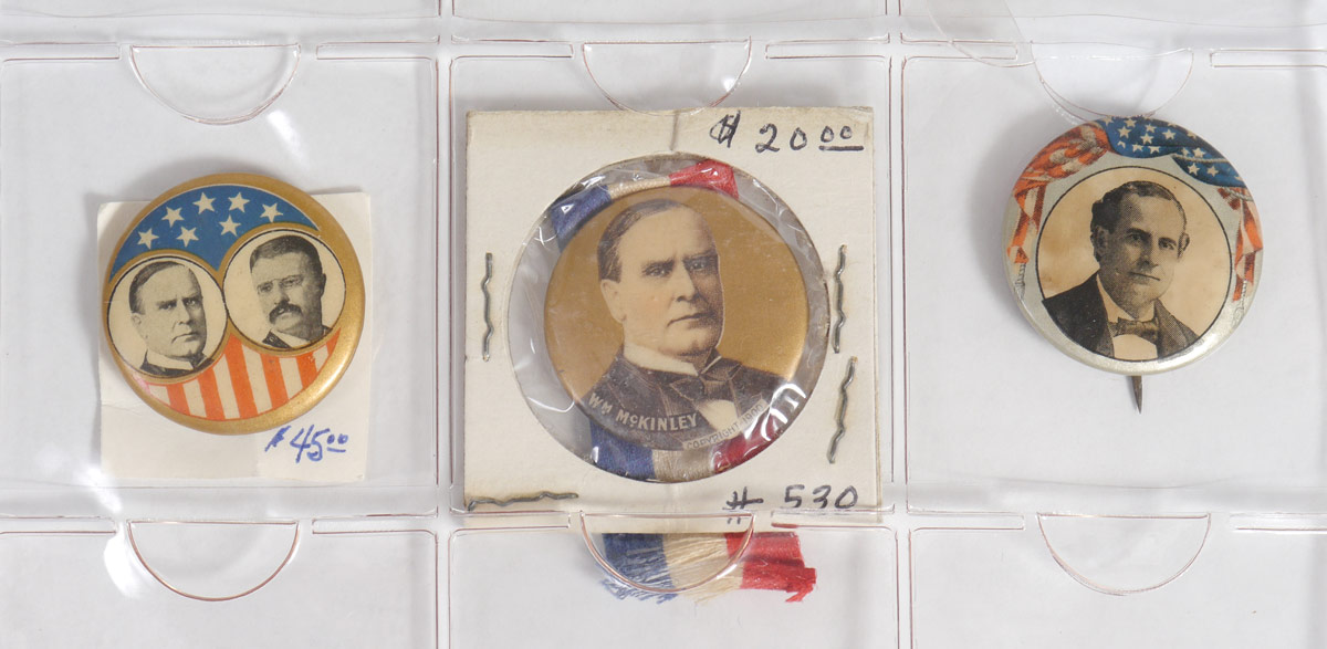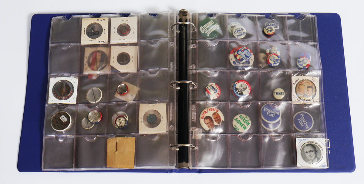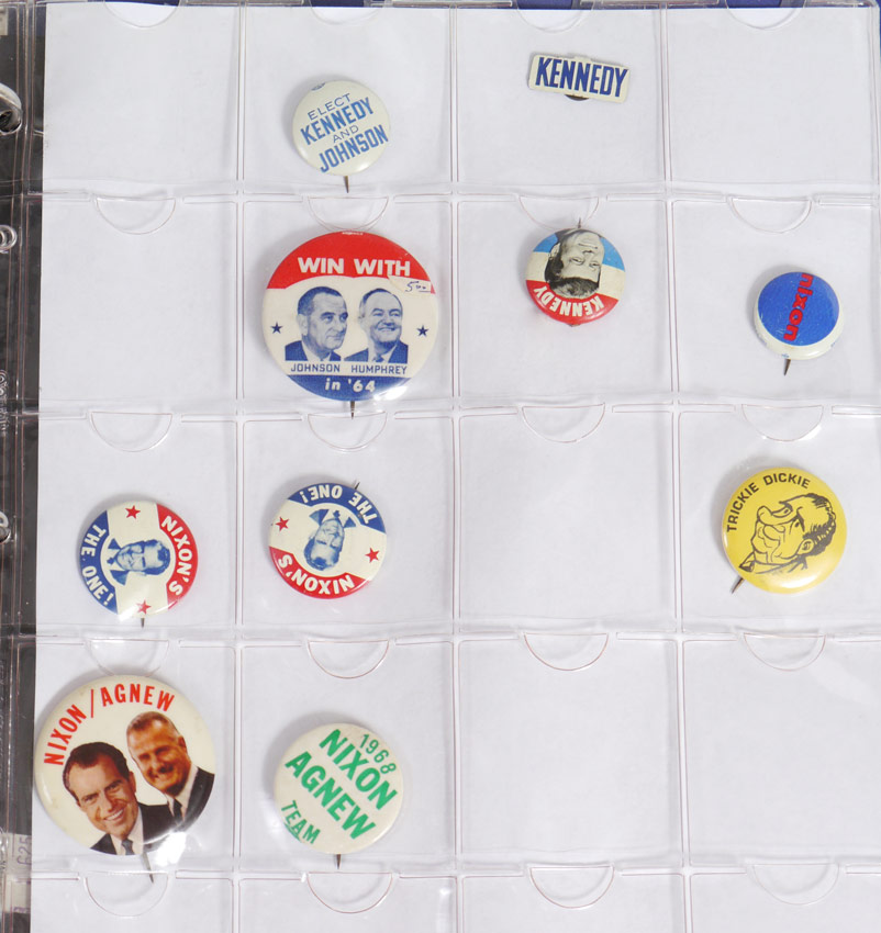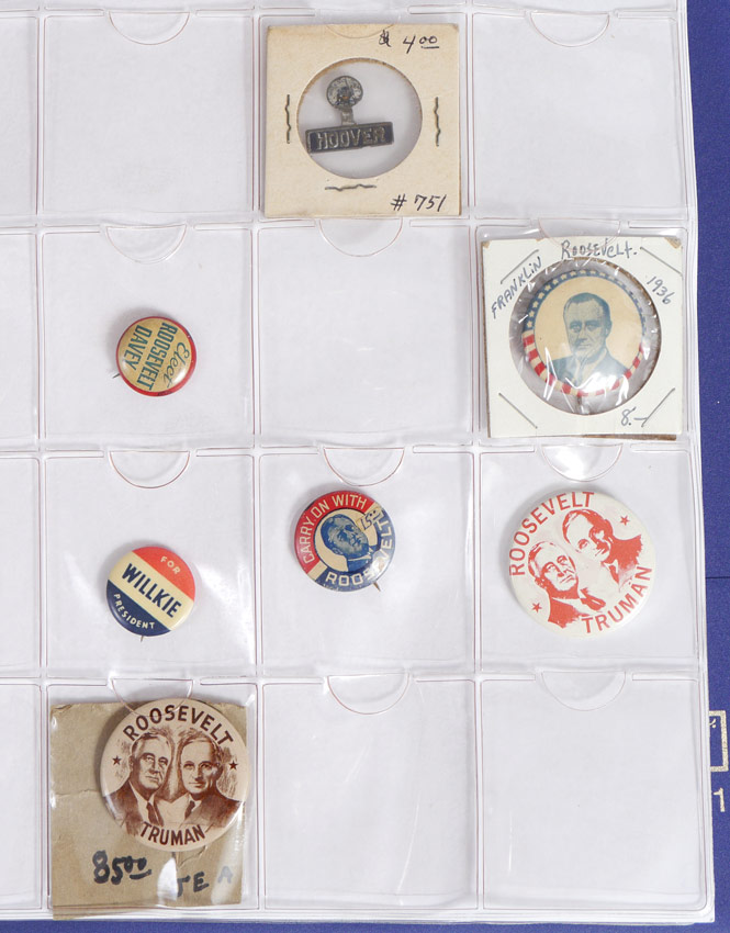 COLLECTION OF POLITICAL CAMPAIGN BUTTONS: 49 total buttons in plastic binder, earliest is a US Grant pinback. To include buttons for McKinley, William Jennings Bryan, Teddy Roosevelt, Wilson/Marshall, Coolidge, Charles Hughes, Harding, Hoover, FDR, Dewey/Bricker, Truman, Nixon, Eisenhower, Stevenson/Kefauver, Kennedy, Johnson, Nixon, Wallace, McGovern, Ford and Carter.