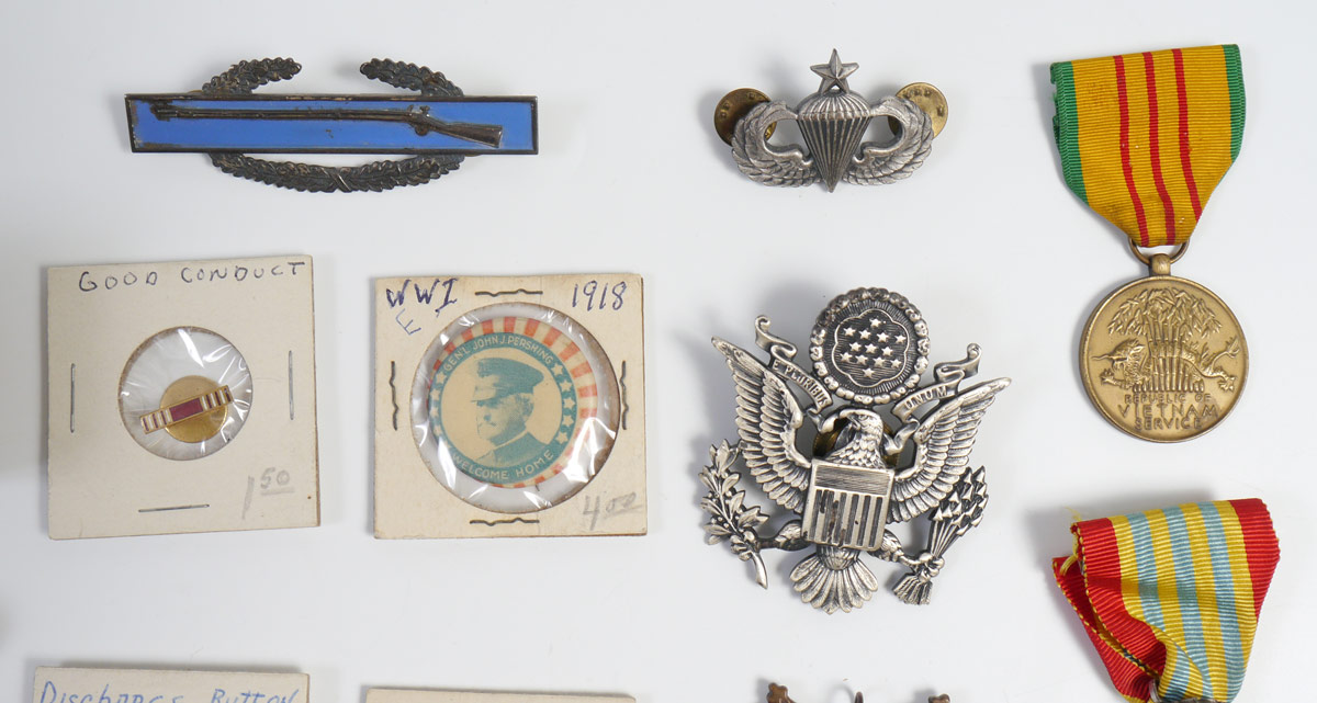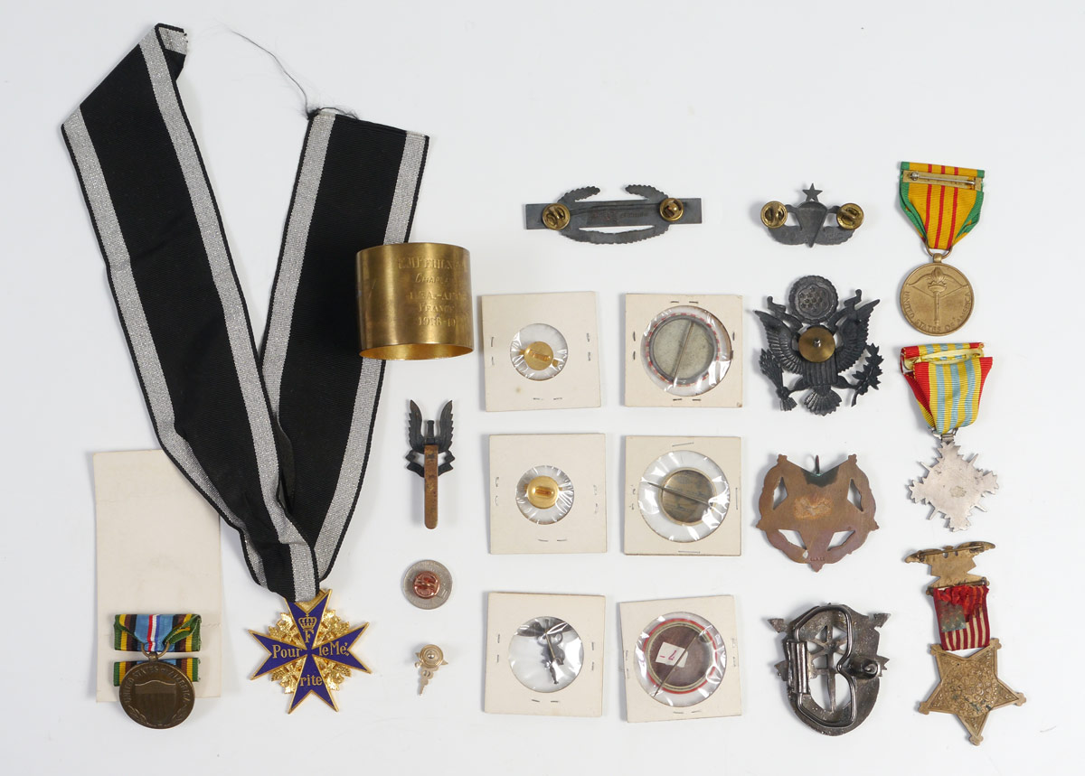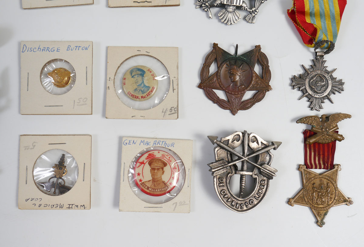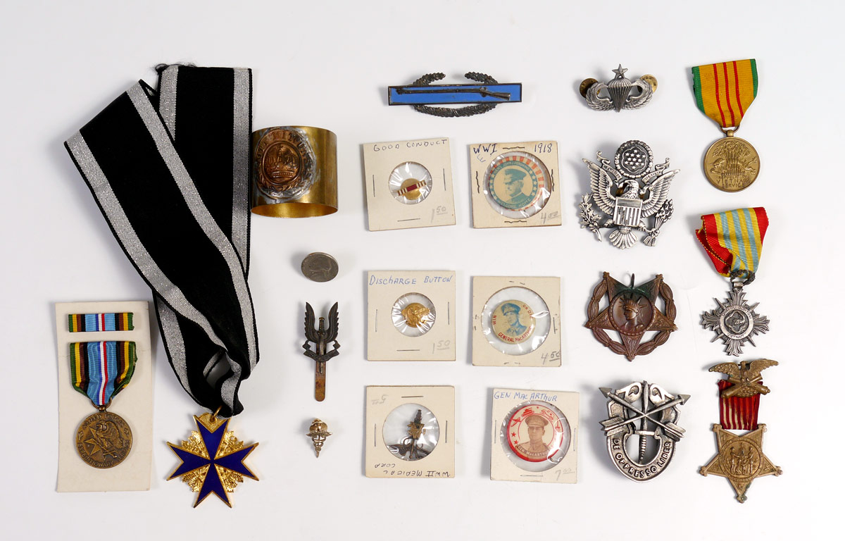 COLLECTION OF MILITARY PINS, BUTTON AND MORE: 19 total pieces to include 1) Prussian Pour le Merite (Blue Max) medal. 2) Civil War GAR medal and ribbon (pinback top has separated). 3) Vietnam Service medal and ribbon. 4) Expeditionary Service medal and bar. 5) Medal of Honour Vietnam 1st class medal and ribbon. 6) Good Conduct pinback. 7) Airborne hat pin. 8) SAS Who Dares Win pin. 9) Medical pin. 10) WWII Medical Corp pin. 11) US Special Forces belt buckle. 12) Unidentified medal with signs of repair. 13) Discharge button. 14) Unidentified sterling pin with Kentucky long rifle. 15) 1961 nickel pinback. 16) John Pershing Welcome Home pinback. 17-18) 2 General MacArthur pinbacks. 19) Eagle hat badge.