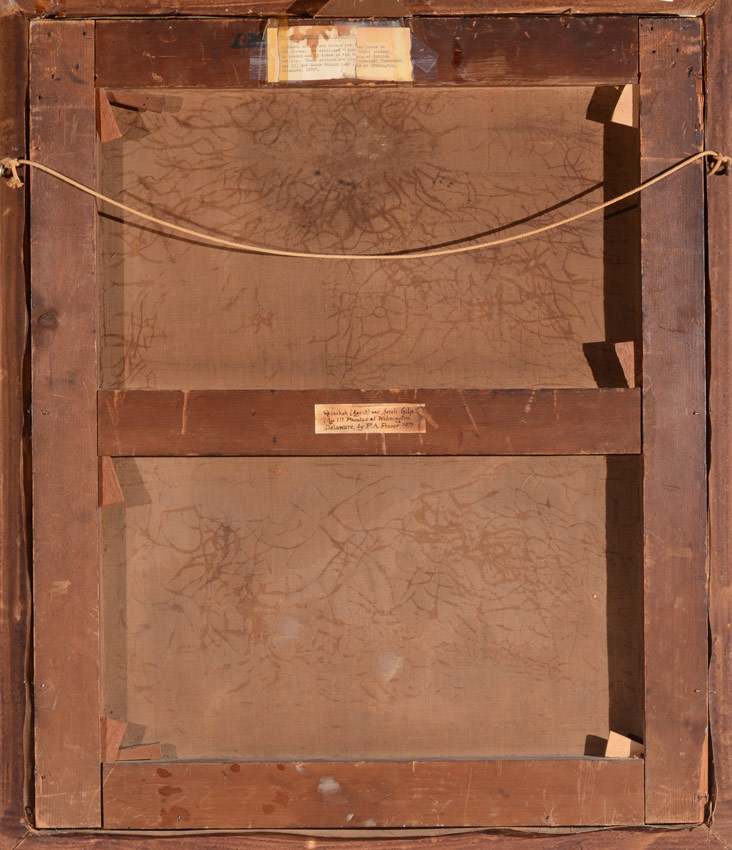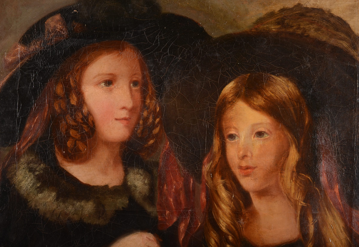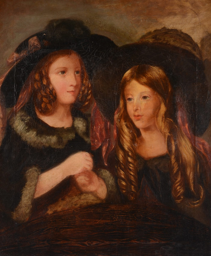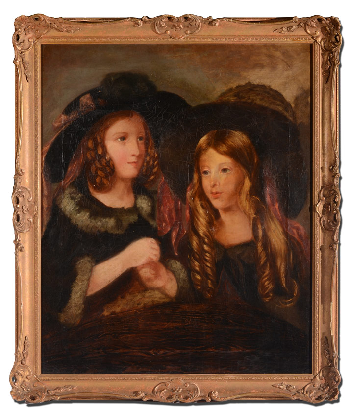 19TH CENTURY PORTRAIT PAINTING ATTRIBUTED TO FRASER: Oil/Canvas, 28 1/2 x 23 3/4'', signed lower right, dated 1879, old label verso indicates this is of Rebeckah & Sarah Gilpin? Painted at Bloomington, Delaware, encased in period pierced carved and gilded gesso frame with wear and repair, 32'' x 27 1/2''.