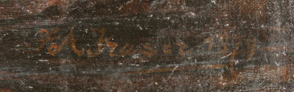 CONDITION: Heavy craquelure throughout, several punctures and patches with scattered inpaint, there is stretcher bar wear, does bear a signature and date lower right, sold as is.