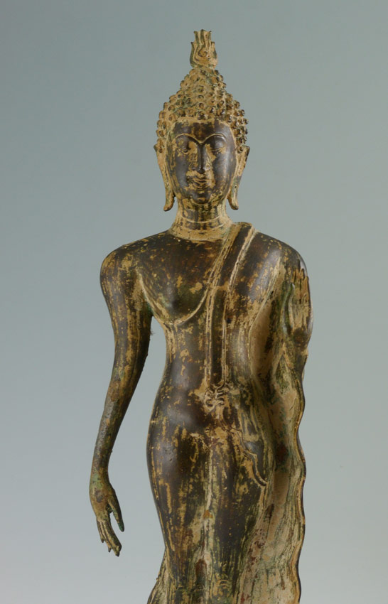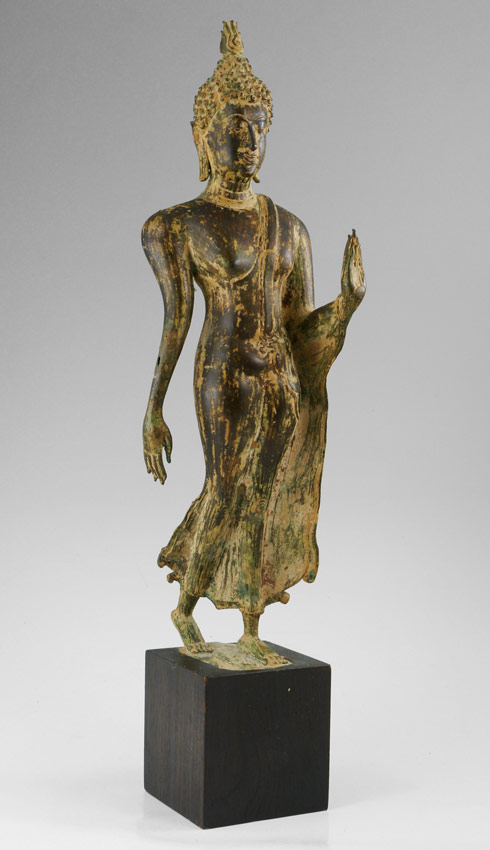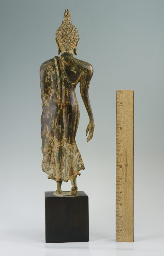METAL STANDING BUDDHA SCULPTURE: In the style of a Thai or Southeast Asia Buddha, paint decorated cast metal. Affixed to wood stand. 19 1/4'' h. x 5'' x 5 3/4''. Actual age unknown.