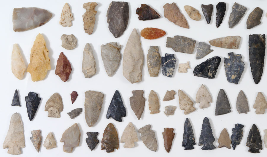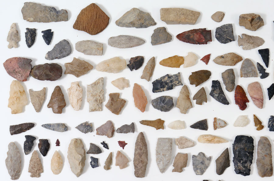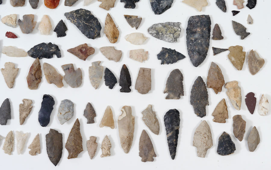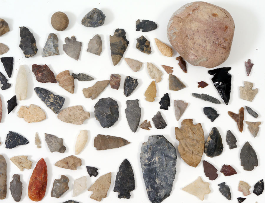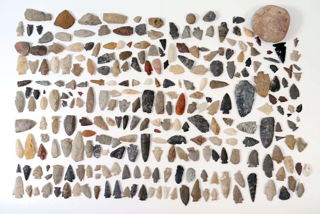 LARGE COLLECTION OF ARROWHEADS: Approx. 274 assorted arrowheads, spear points, and pottery fragments. An assembled collection with points from all over the United States and of different materials, from tiny bird points to large spear points, quartz to obsidian and all types in between.