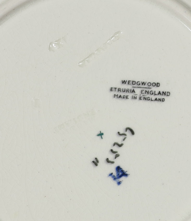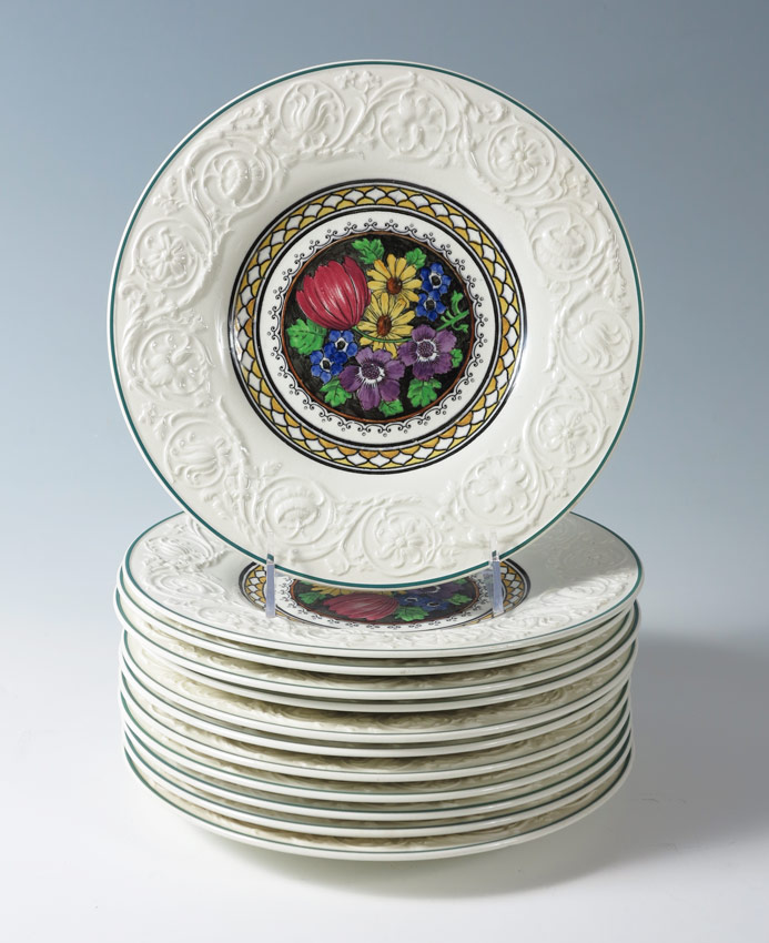 SET OF 12 WEDGWOOD PLATES: Embossed rim with floral motif. Impressed and underglaze Wedgwood markings. 9'' dia.