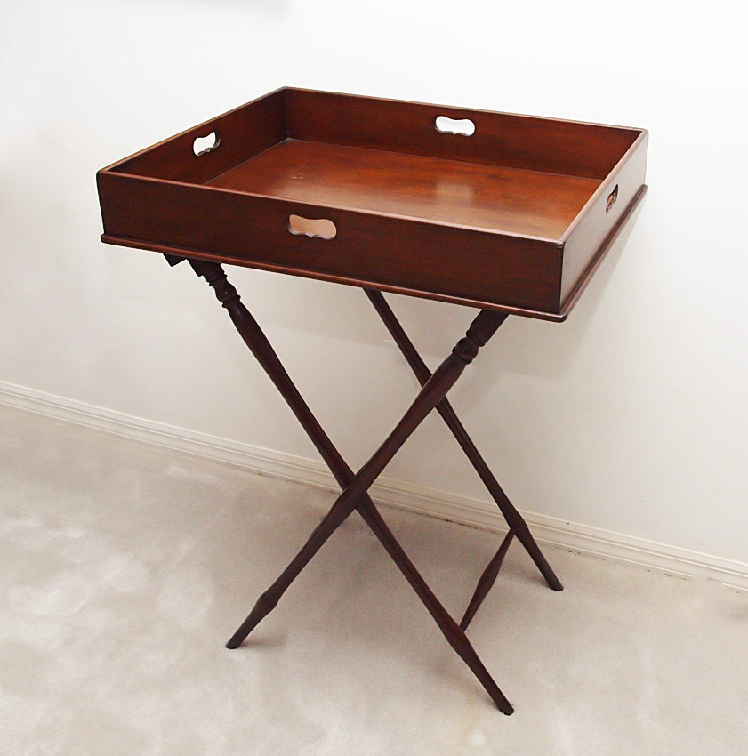 MAHOGANY BUTLER TRAY ON FOLDING STAND: Tray 4 1/2'' x 28 3/4'' x 22 1/4'', stand open 34 1/2'' h. x 27 1/2'' x 18''