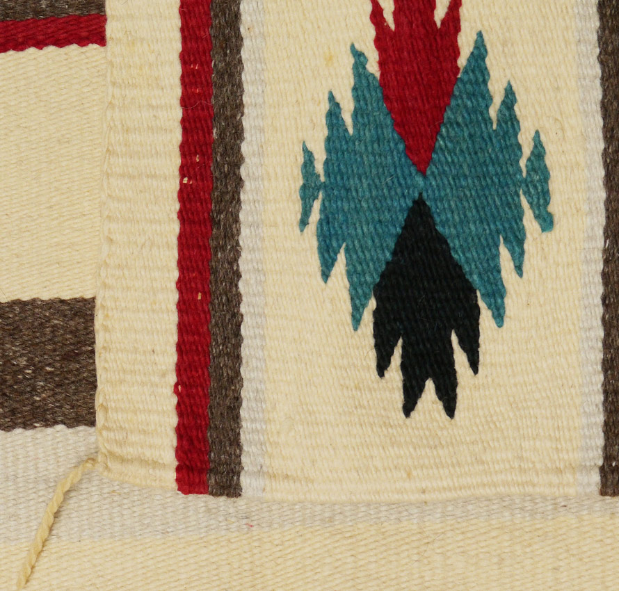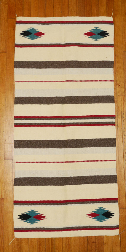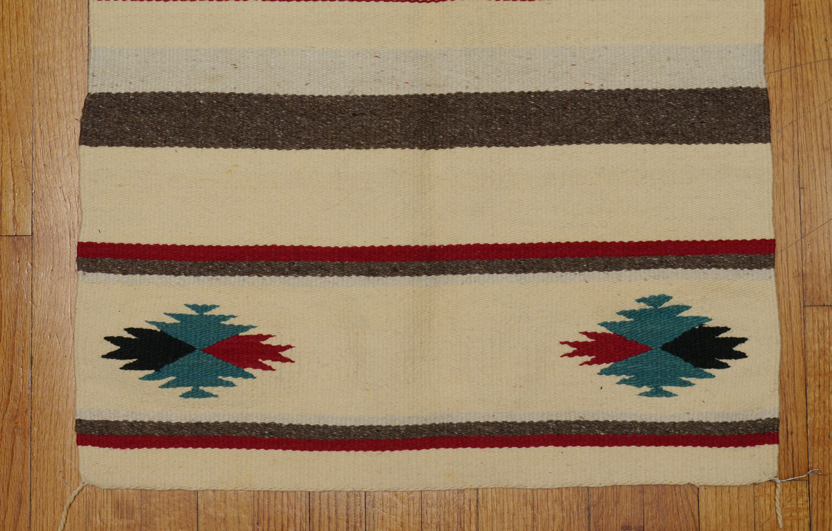 MODERN NAVAJO HAND WOVEN BLANKET, 62'' x 28 1/2'': This Navajo rug / blanket has a simple design of colored stripes with stepped medallions on each end. The colors used include turquoise, black & red in the medallions, white, red, brown & cream in the strips.