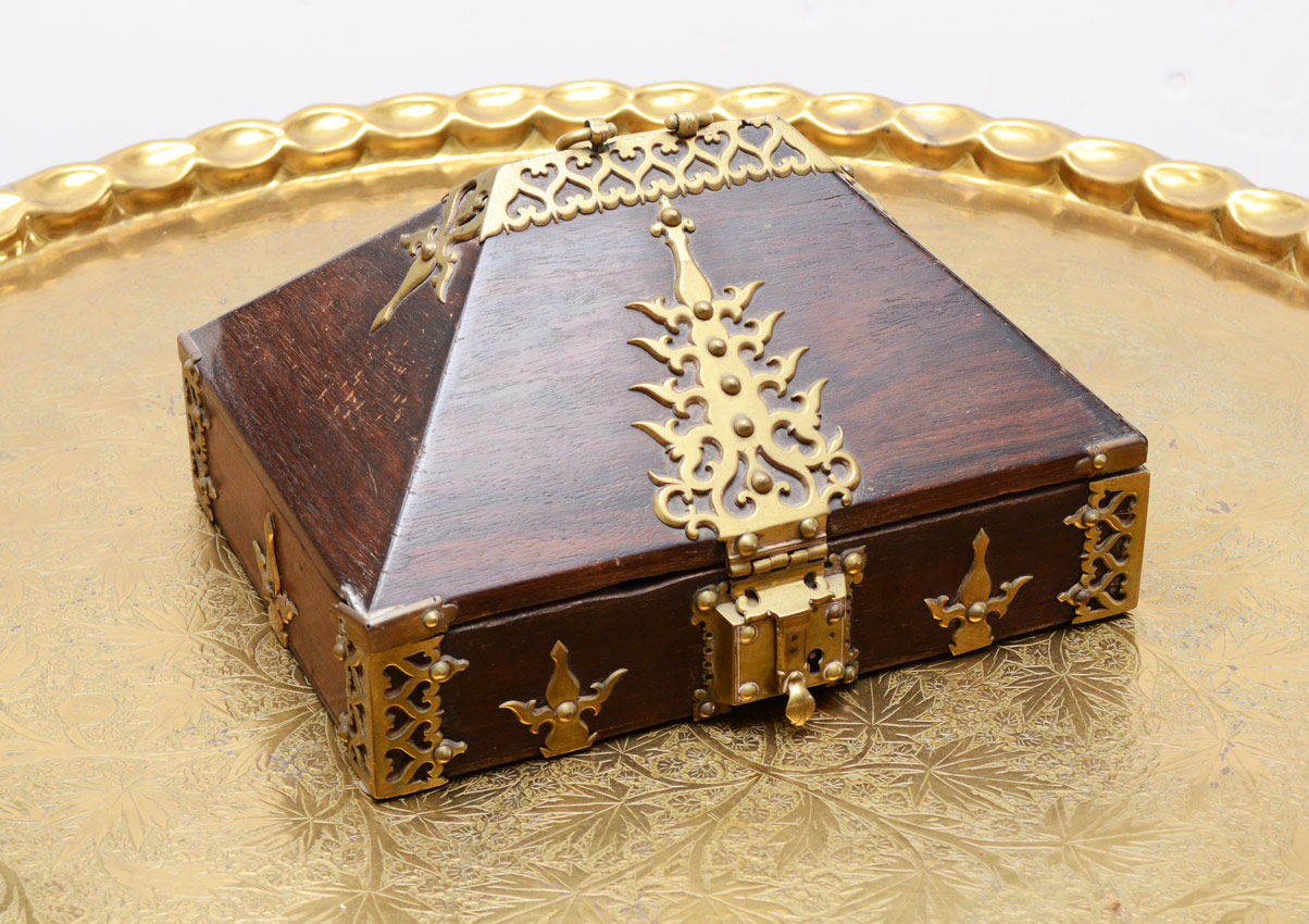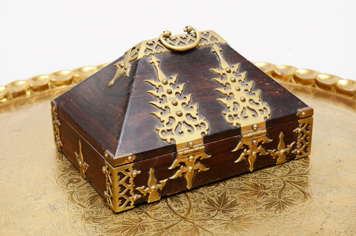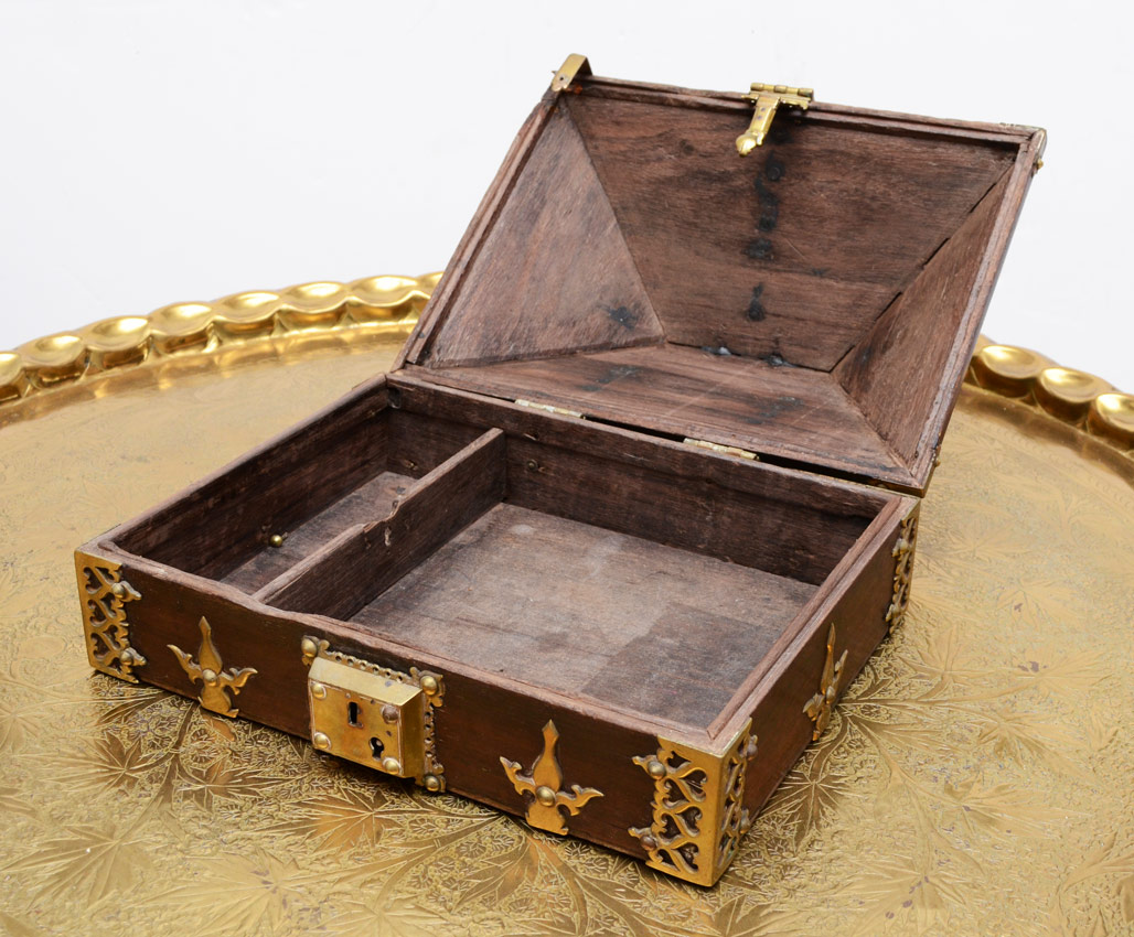 EARLY BRASS DECORATED BRIDES BOX: Shaped top with brass handle and decoration. Double compartment interior. 8'' h. x 13 1/2'' x 10 1/4''.