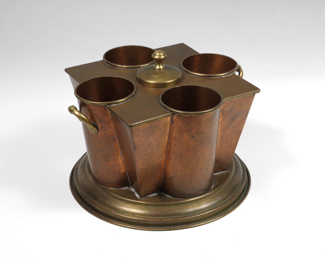 ART DECO COPPER WINE COOLER: Holds 4 bottles and ice in center covered section. Measures 9 1/2'' x. 12 3/4'' dia.