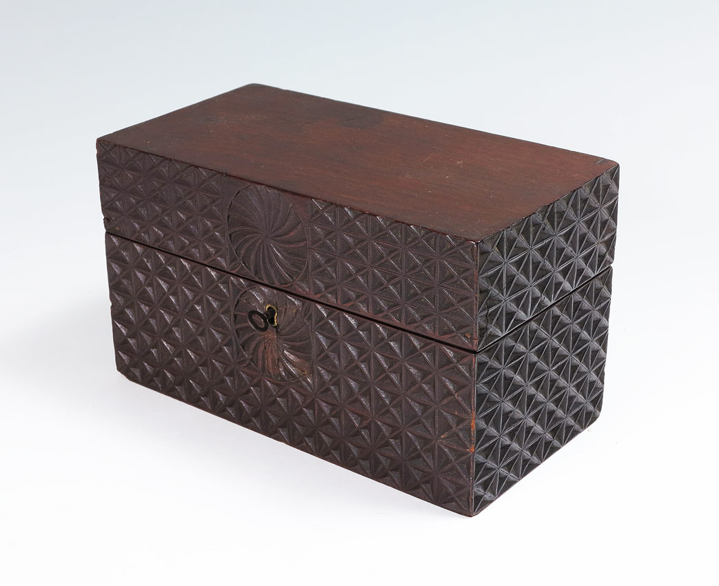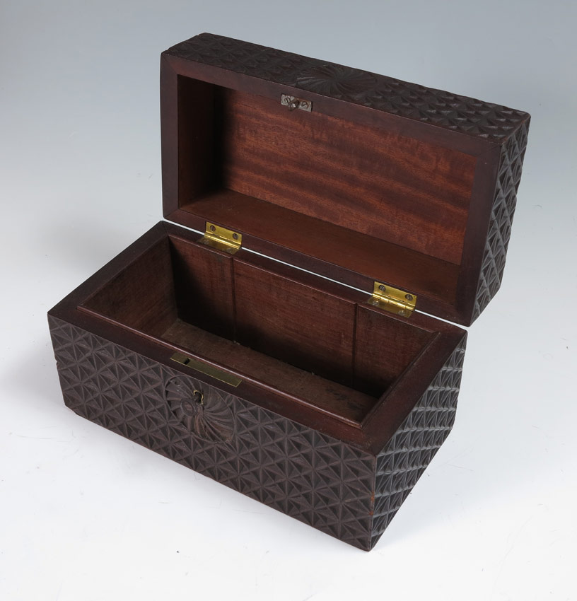 CARVED TEA CADDY: Geometric designs carved on all 4 sides, lock currently working with key in office. Measures 5 3/4'' h. x 9 3/4'' x 5''.