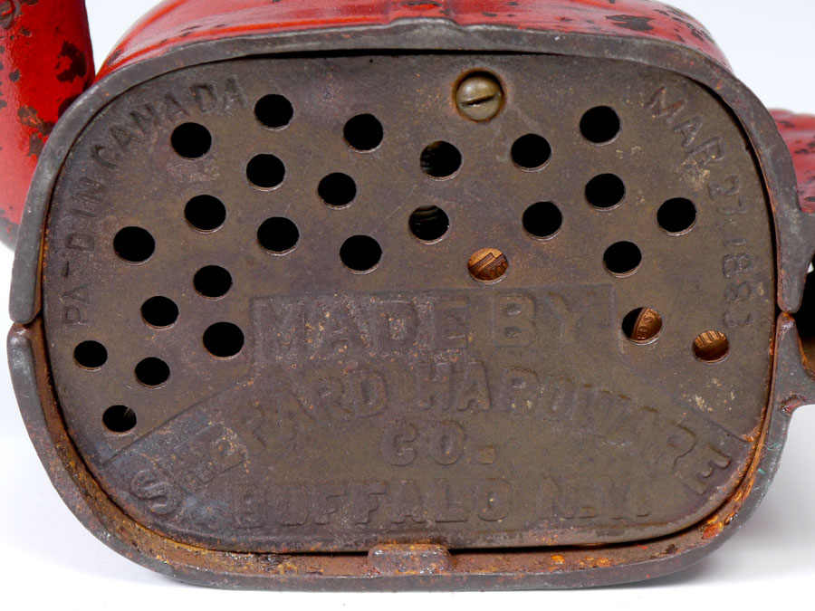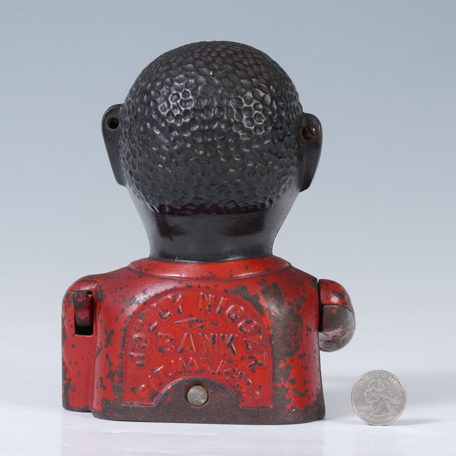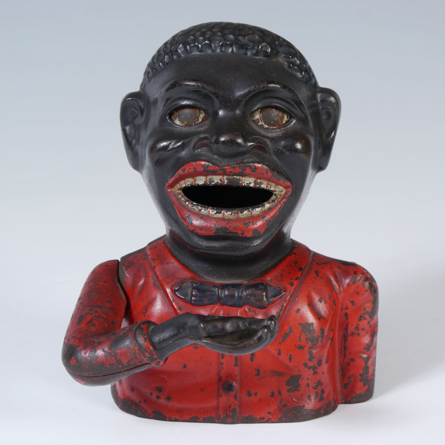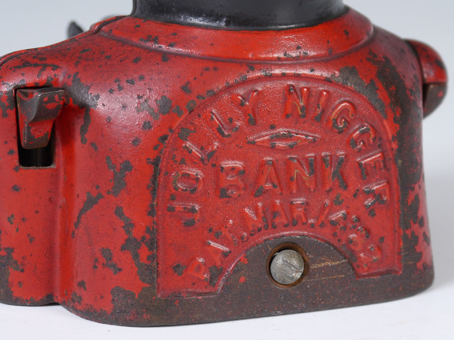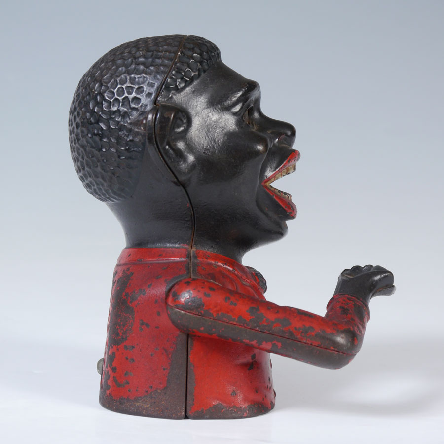 SHEPARD JOLLY NIGGER CAST IRON MECHANICAL BANK: Made by Shepard Hardware Co., Buffalo, N.Y. with Canadian patent date March 27, 1883. 6 3/4'' h. x 5 1/2'' x 5''.
