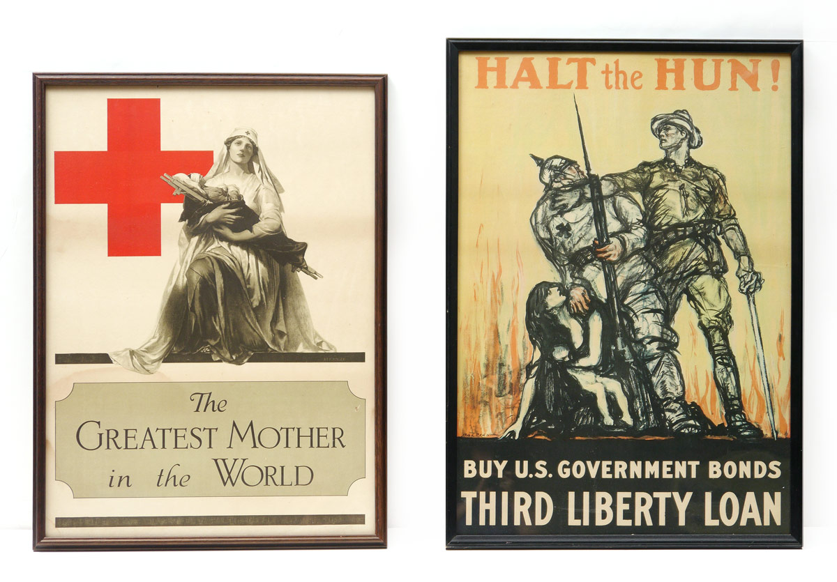 2 WORLD WAR I LITHOGRAPH POSTERS: To include 1) Raleigh, Henry, ''Halt the Hun'' Liberty Loan poster, sight size 28 1/2'' x 19 3/4'', framed under Lexan 30 1/4'' x 21 1/4''. 2) Foringer, Alonzo, ''The Greatest Mother in the World'' Red Cross poster, sight size 26 1/2'' x 19 1/2'', framed under Lexan 28'' x 21''.