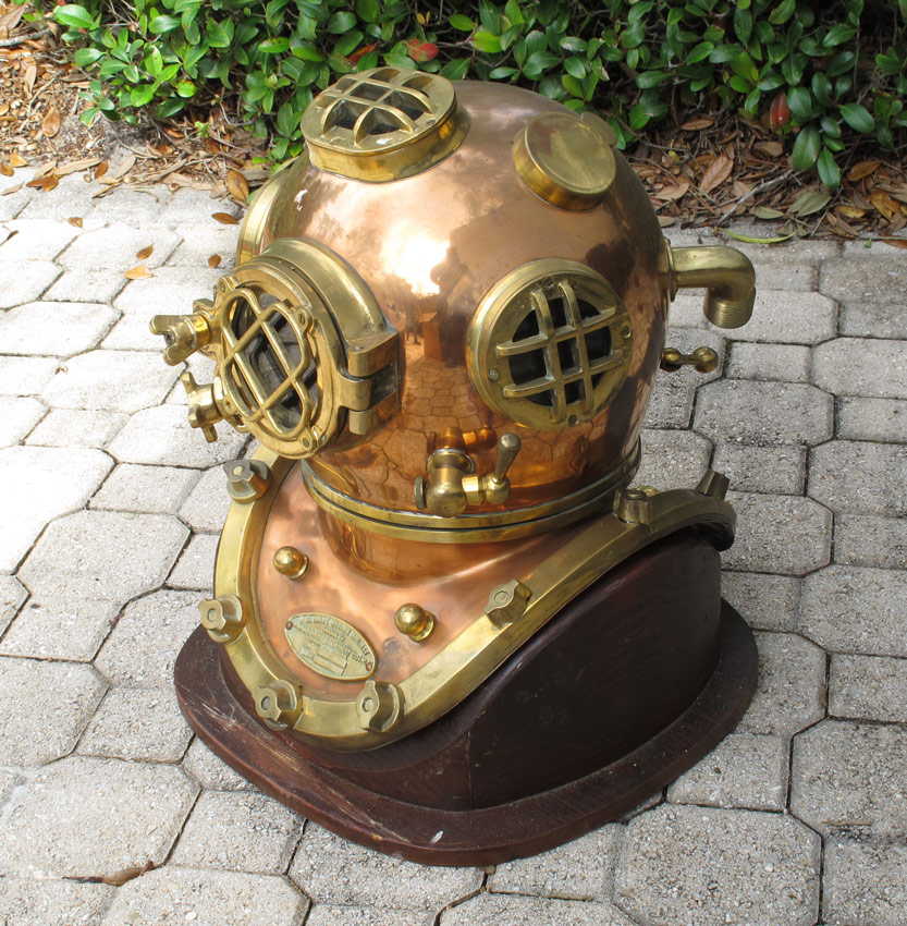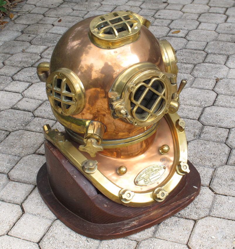 DECORATIVE MARK V BRASS DIVER'S HELMET: Decorative 1980's replica of a US Navy Mark V diving helmet. Bradd plaque reads US Navy Diving Helmet, Mark V, Morse Diving Equipment Co., Boston Mass.''. Sold with wood stand. Overall with stand measures 20 1/2'' x 16'' x 16''.
