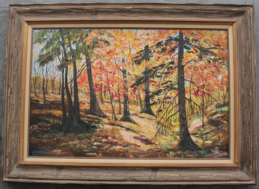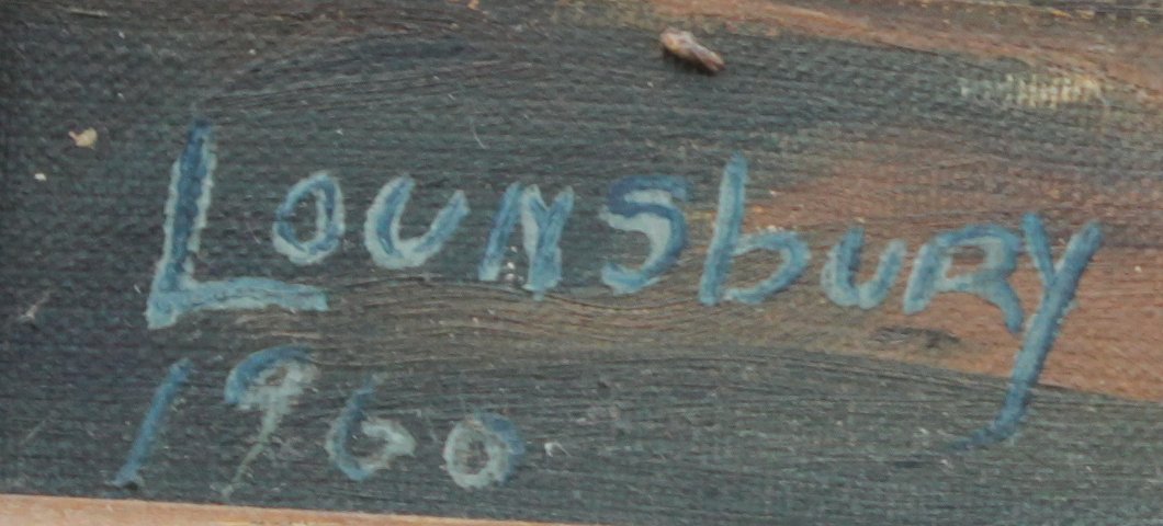 GOOD AUTUMNAL LANDSCAPE PAINTING SIGNED LOUNSBURY: Oil/Canvas, 24'' x 36'', signed lower left, dated 1960, encased in barnwood style carved wood frame, 23 1/2'' x 46''.