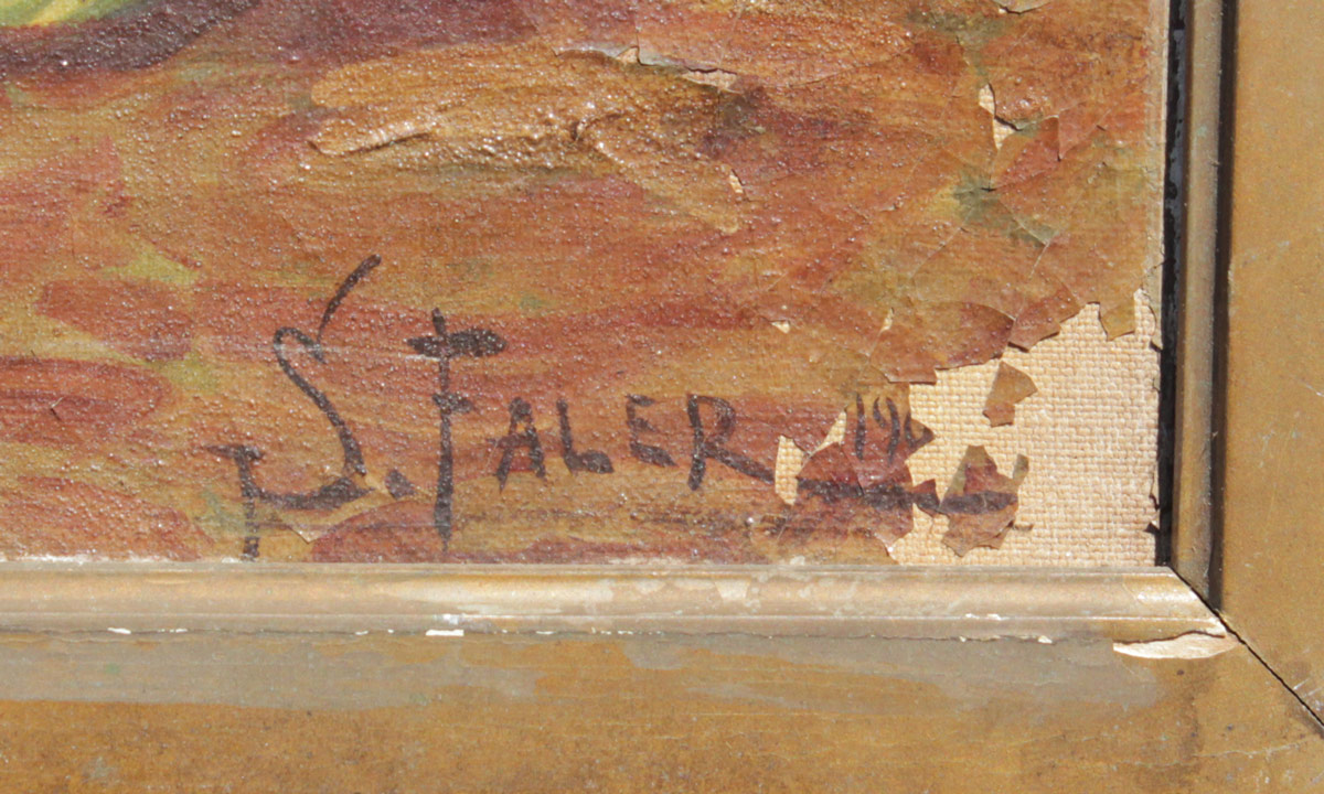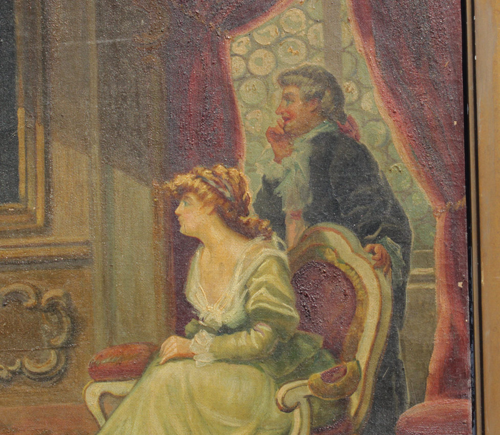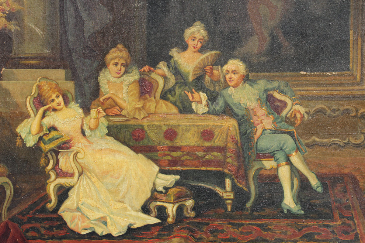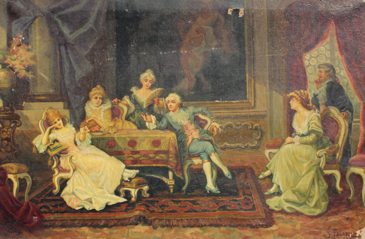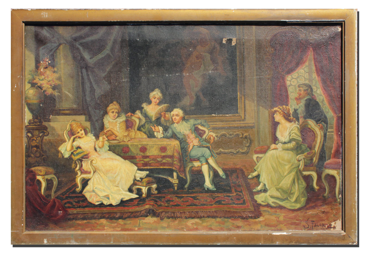EARLY 20TH CENTURY INTERIOR GENRE PAINTING SIGNED S. FALER: Depicts French Interior Salon Scene with Figures Conversing, Oil/Canvas, 20'' x 30'', signed and dated lower right 190?, gilded liner with wear 22'' x 32''.