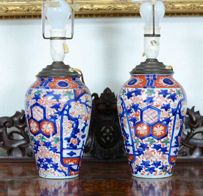 PAIR IMARI PORCELAIN LAMPS: Cobalt and iron red with green. The porcelain measures approx. 10'' tall.