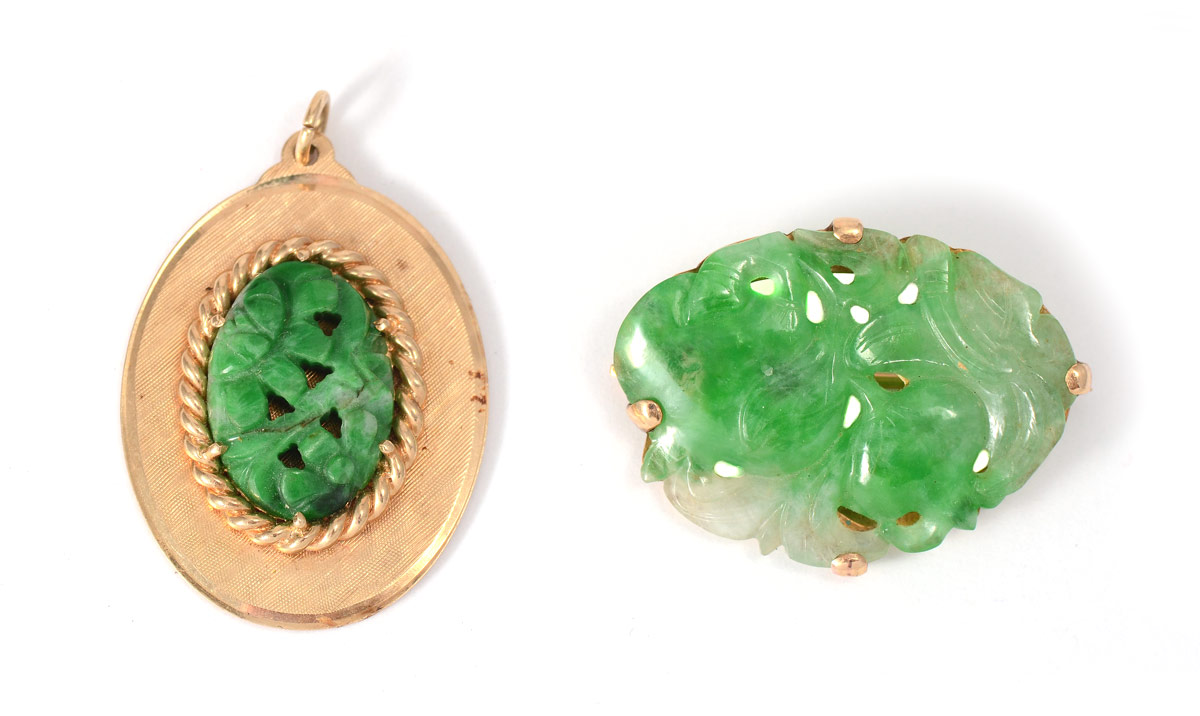 2 PIECE CARVED JADEITE BROOCH & PENDANT: 1) 14K yellow gold pendant with carved/pierced 20.00 x 13.00 mm oval jadeite. 2) 14K yellow gold brooch with 30.00 x 20.00 mm carved/pierced oval jadeite. Gold Weight: 12.0 grams approx.