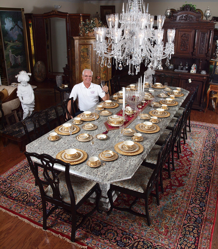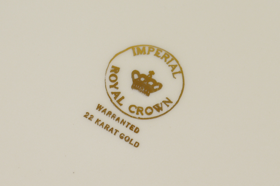 IMPERIAL ROYAL CROWN CHINA 22KT GOLD BORDER: Approx. 91 pieces to include 12 dinner plates, 11 salad plates, 12 bread plates, 12 cream soup with 12 underplates, 12 cups, 12 saucers, covered vegetable, open vegetable, gravy, creamer, sugar, and 3 platters (13-16'').