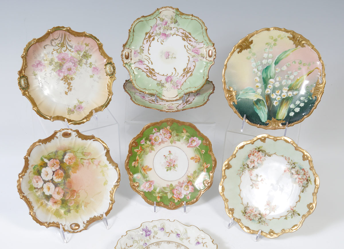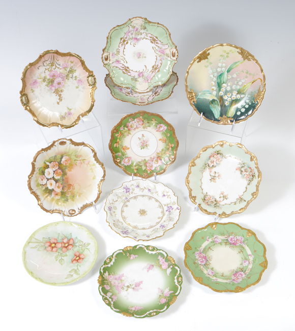 GROUP OF 11 FRENCH LIMOGES CABINET PLATES: Ca. 1891-1914. Marked with the green star mark of Coiffe. 8 1/2'' dia. Some are handpainted, all decorated in a unique floral design with ornate border.