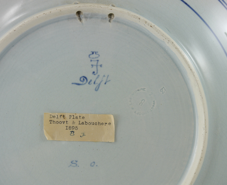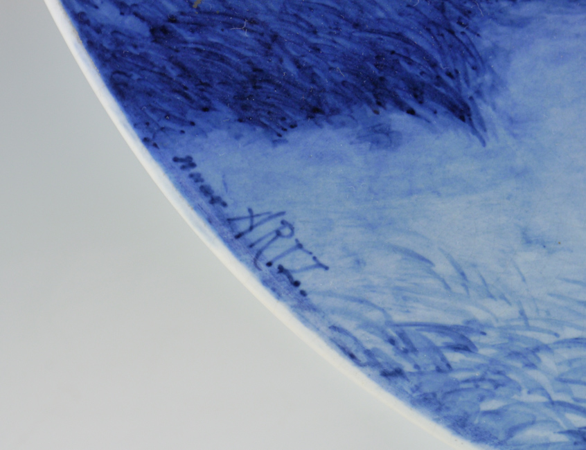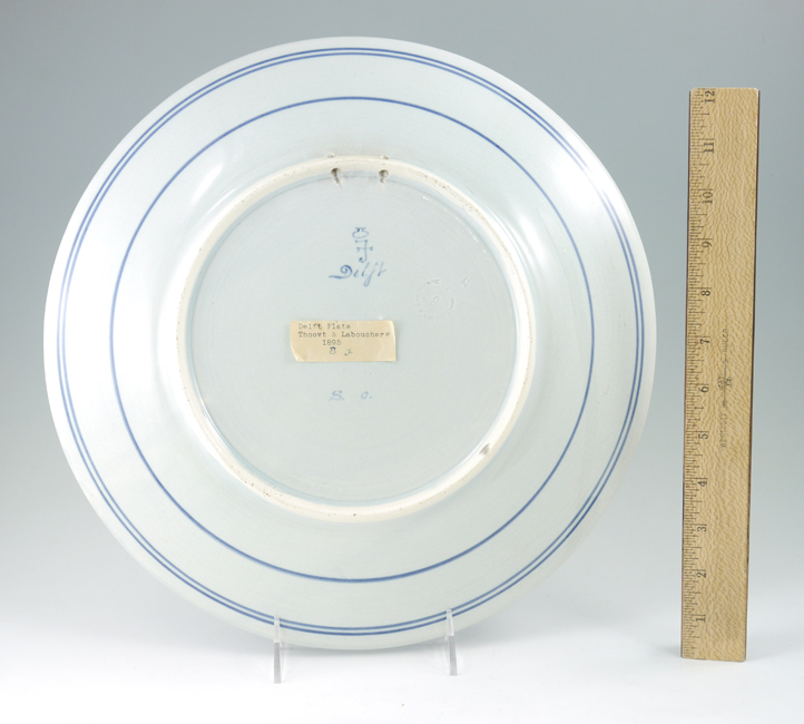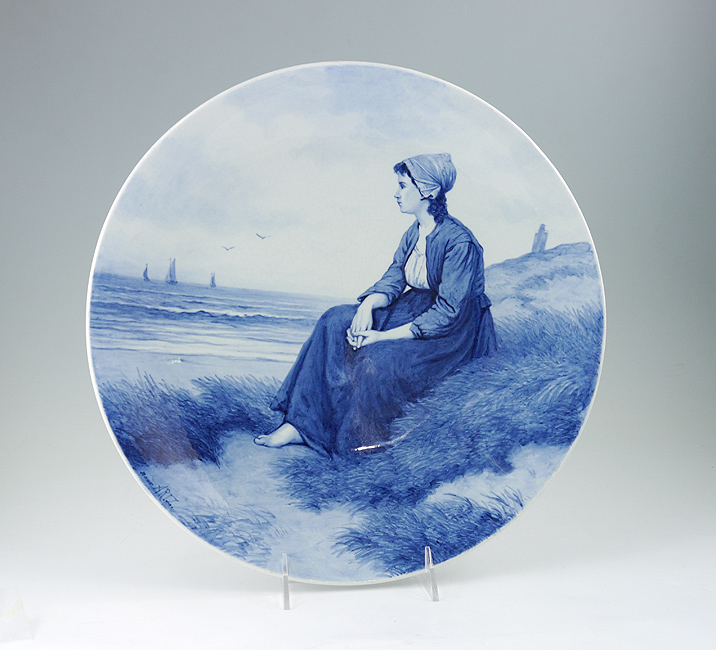 THOOFT & LABOUCHERE DELFT CHARGER: Image of a woman seated seaside with a lighthouse and boats in the background. Impressed Thooft & LaBouchere mark with under glaze marks as well. 13 1/2'' dia.