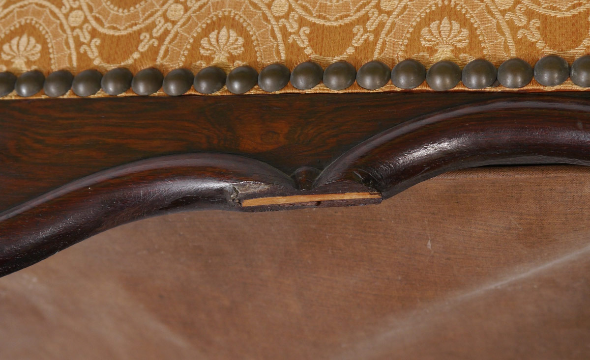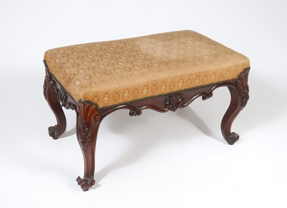 SMALL ROSEWOOD FRENCH STYLE CARVED BENCH: Carved and shaped skirt and legs. Patterned and tacked upholstery. 18'' h. x 37 1/4'' x 17 1/2''.